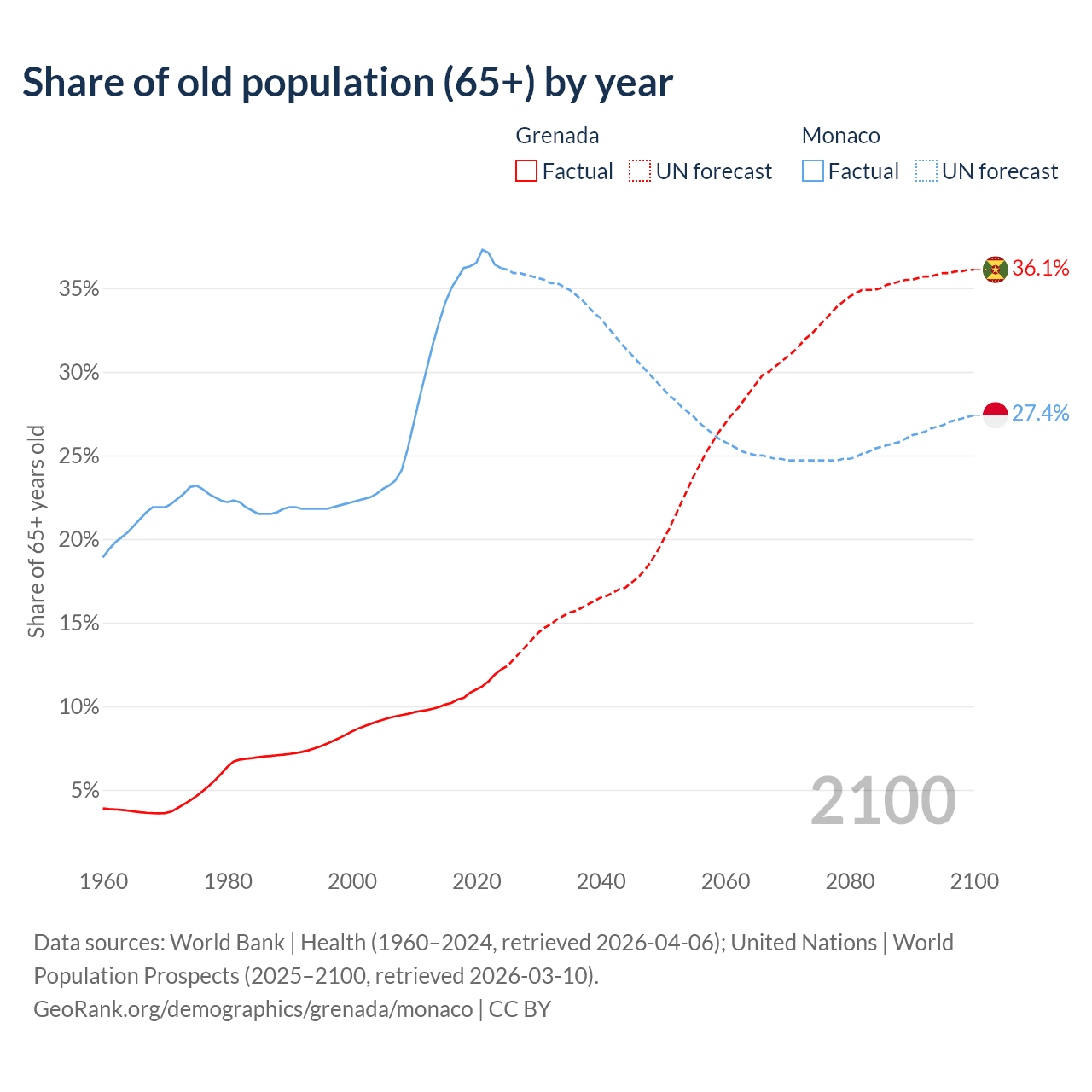 The share of older people aged 65 and over is 12.2% in Grenada and 36.2% in Monaco. Life expectancy in Grenada compared to Monaco .