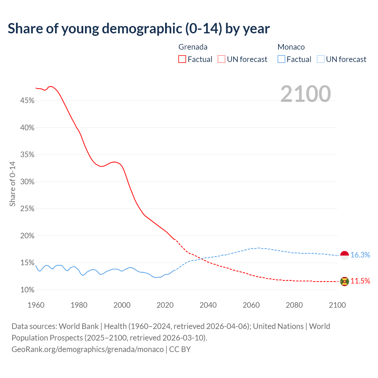- The share of young demographic (0-15 years old) in Grenada is 19.4% vs 13.5% in Monaco.