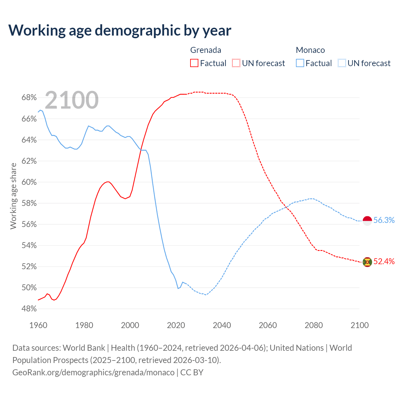 - Grenada has 80.2K working age adults (aged 15-64) vs 19.2K in Monaco.