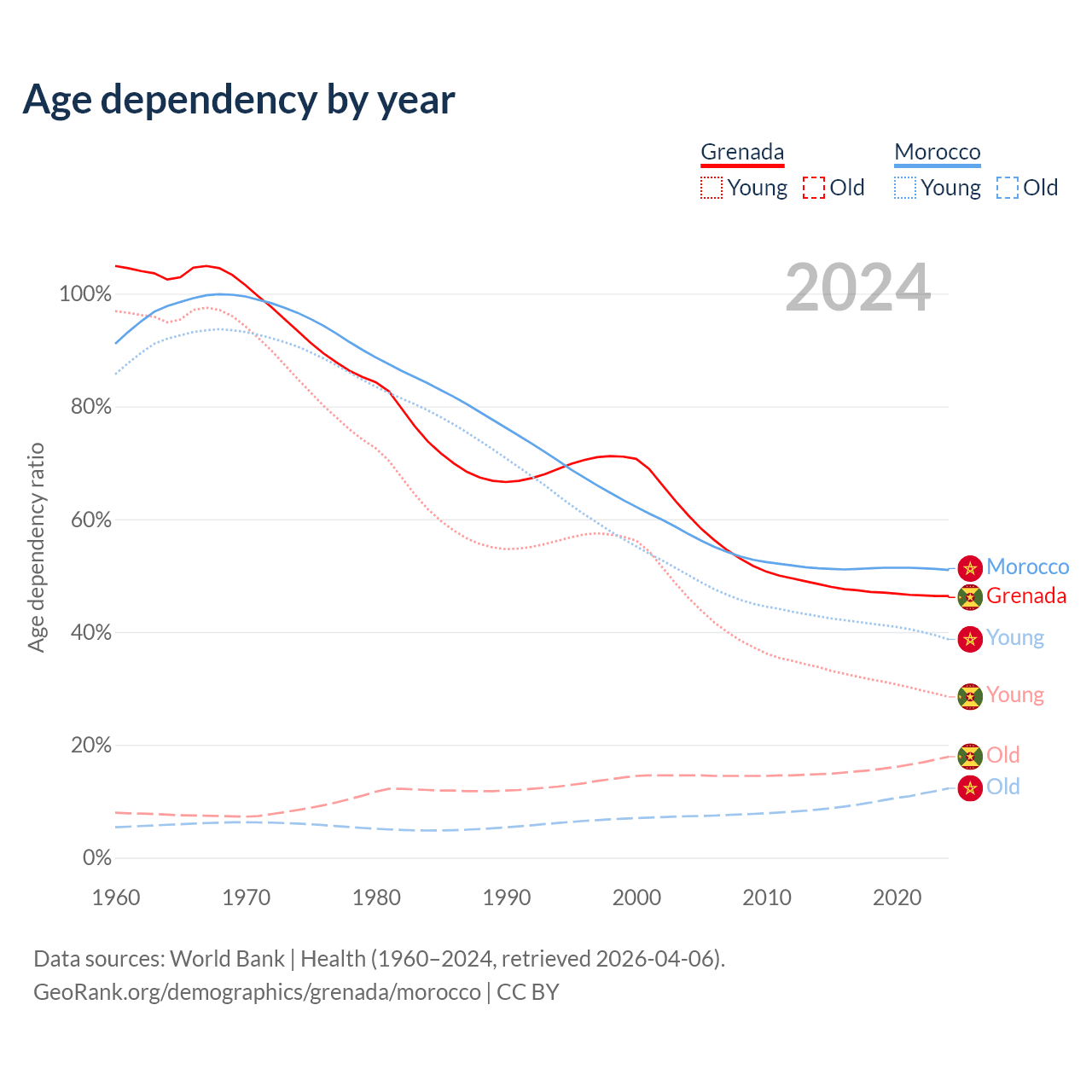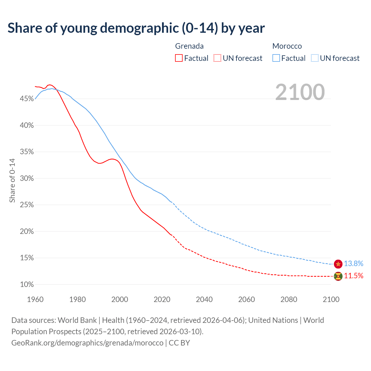 - The share of young demographic (0-15 years old) in Grenada is 19.4% vs 25.6% in Morocco.
