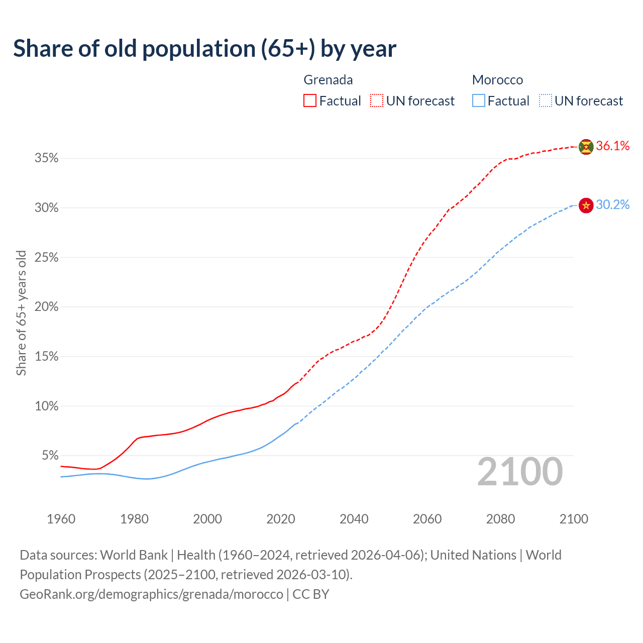 The share of older people aged 65 and over is 12.2% in Grenada and 8.14% in Morocco. Life expectancy in Grenada compared to Morocco .