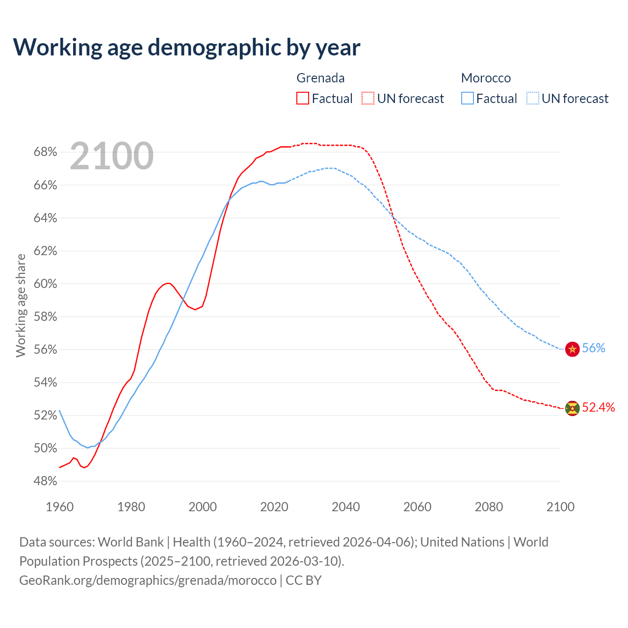 - Grenada has 80.2K working age adults (aged 15-64) vs 25.7M in Morocco.