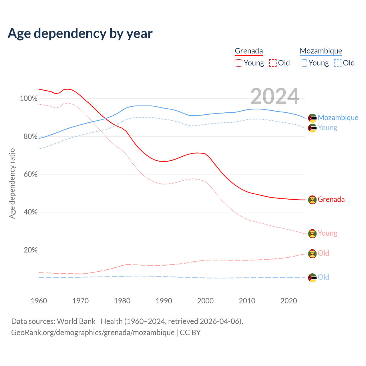 - The share of old-age demographic (65+) in Grenada is 12.2% vs 2.75% in Mozambique.