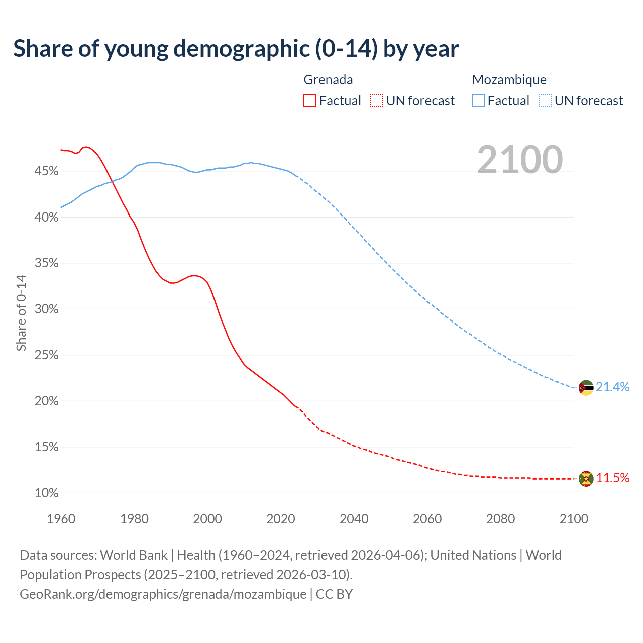 - The share of young demographic (0-15 years old) in Grenada is 19.4% vs 44.5% in Mozambique.
