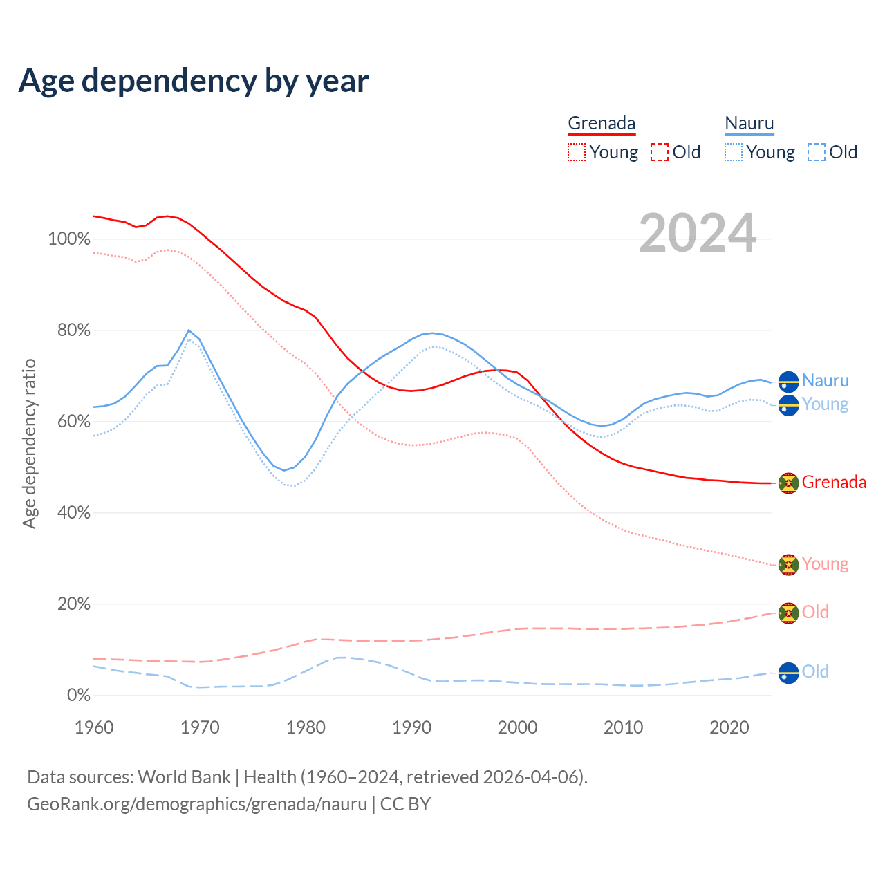 - The share of old-age demographic (65+) in Grenada is 12.2% vs 2.85% in Nauru.