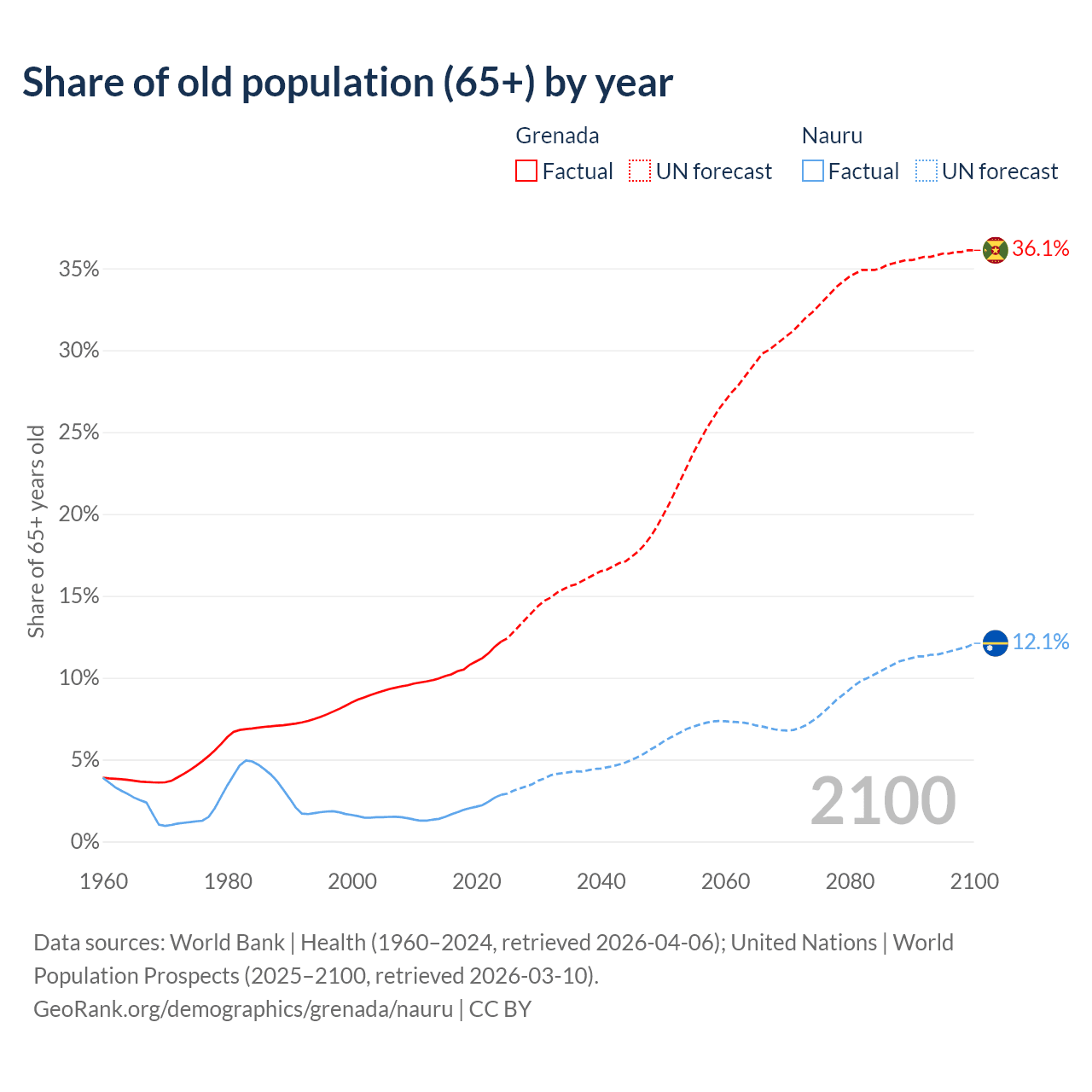 The share of older people aged 65 and over is 12.2% in Grenada and 2.85% in Nauru. Life expectancy in Grenada compared to Nauru .