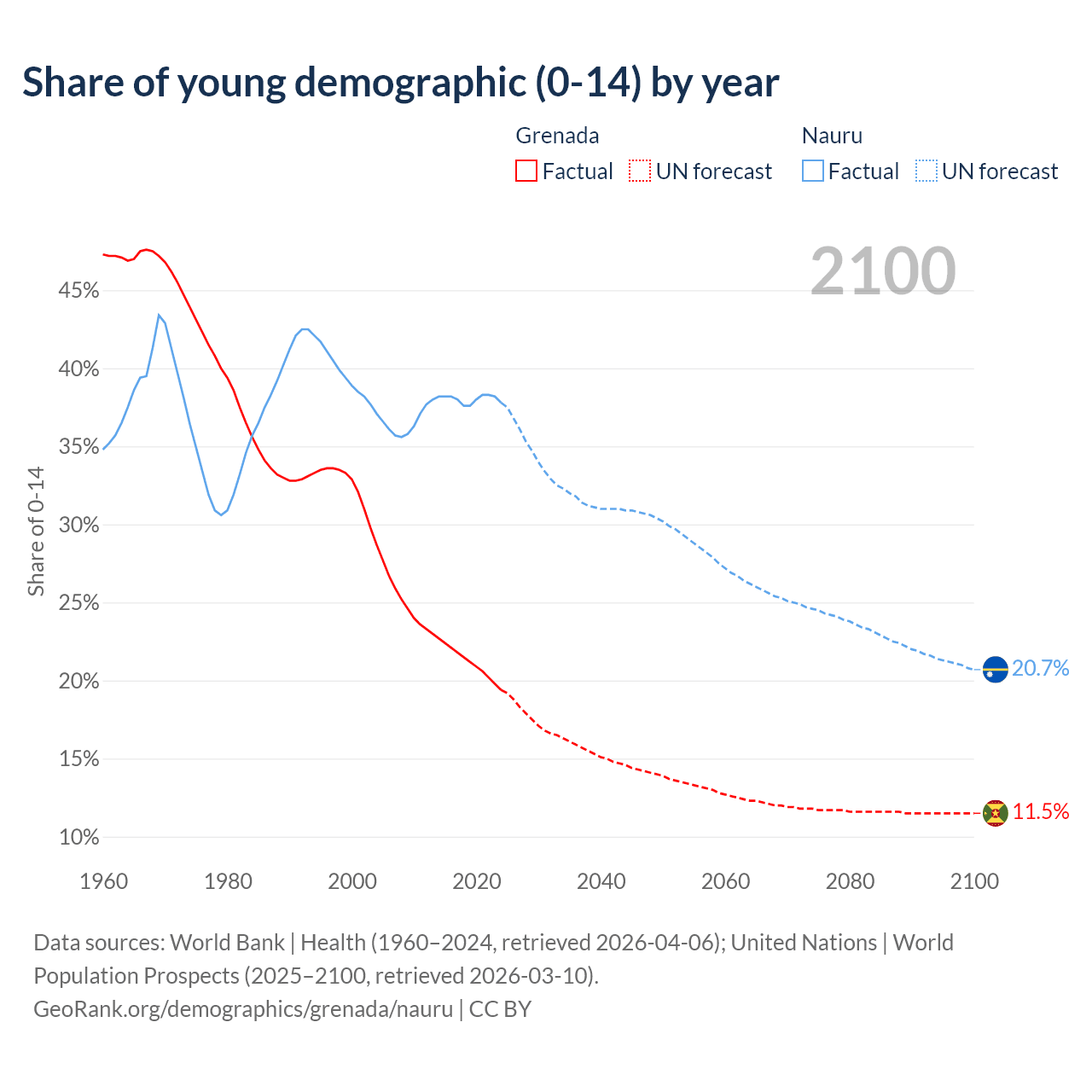 - The share of young demographic (0-15 years old) in Grenada is 19.4% vs 37.8% in Nauru.