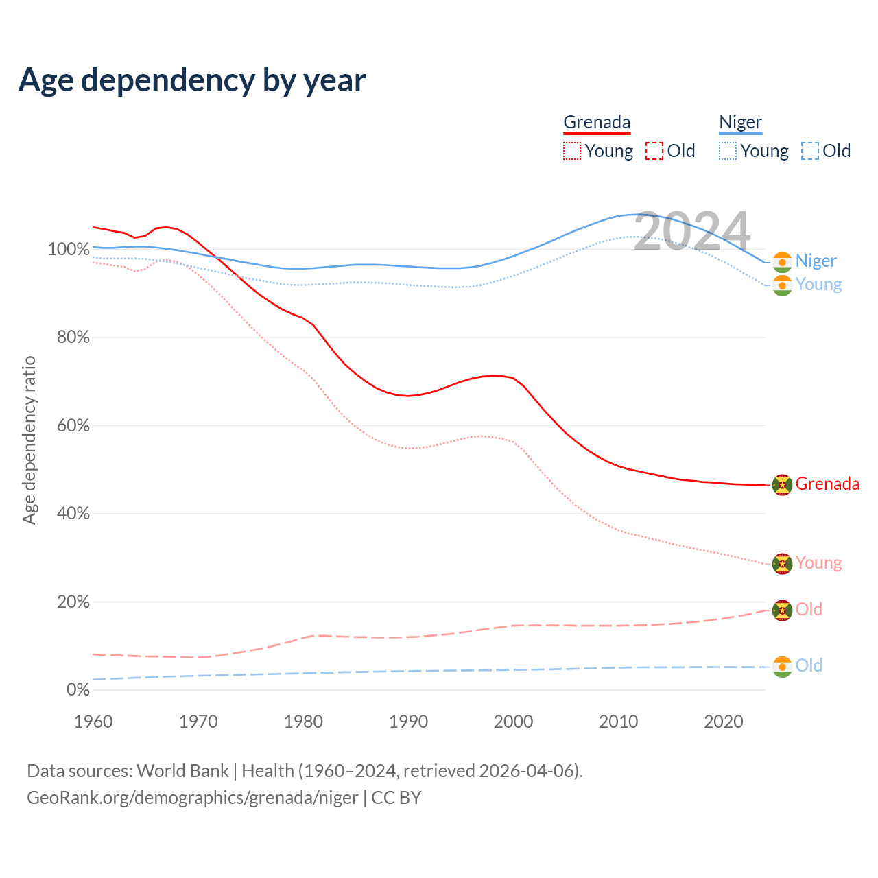 - The share of old-age demographic (65+) in Grenada is 12.2% vs 2.59% in Niger.