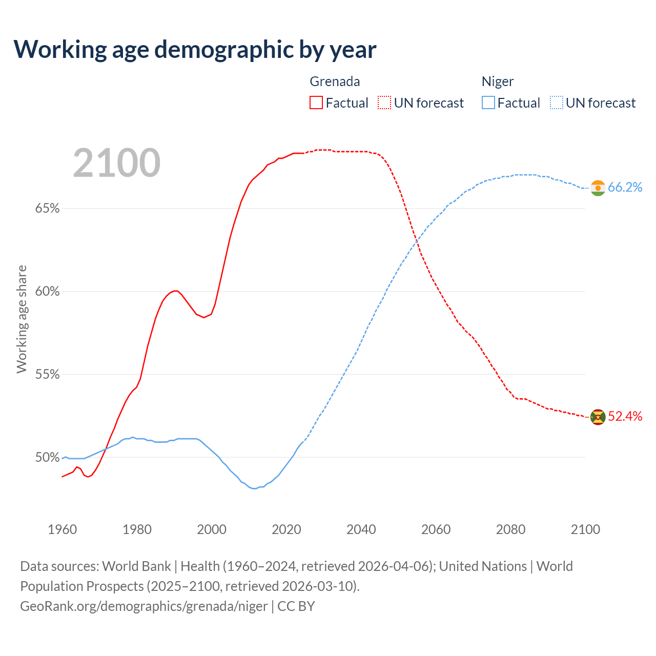 - Grenada has 80.2K working age adults (aged 15-64) vs 14.8M in Niger.