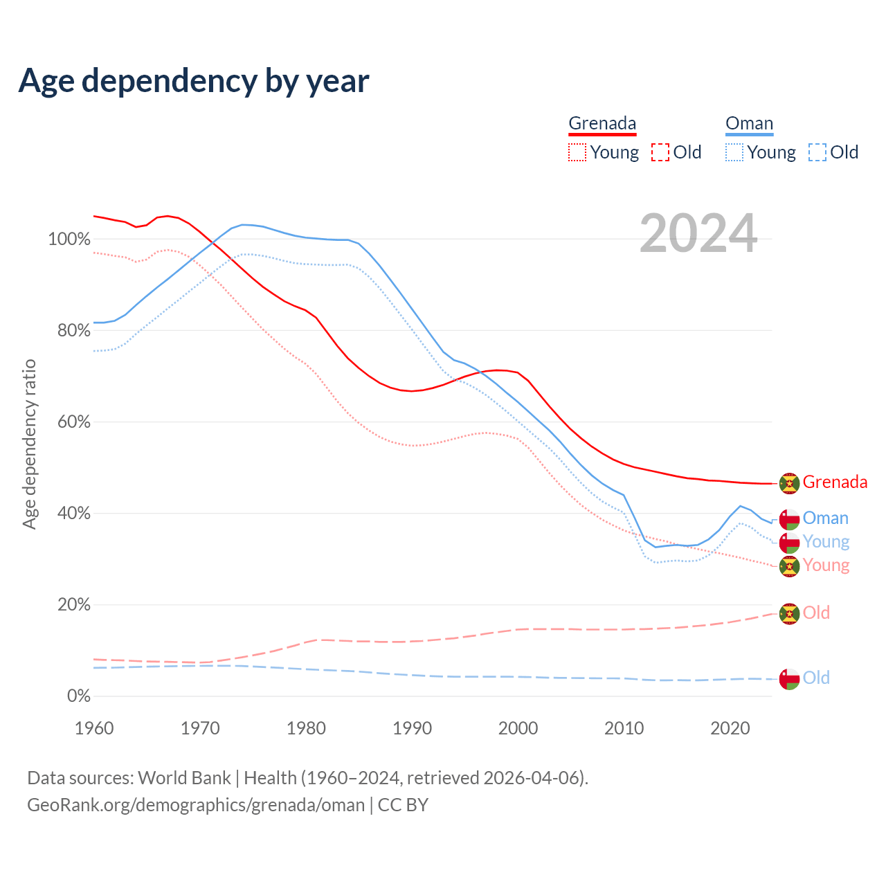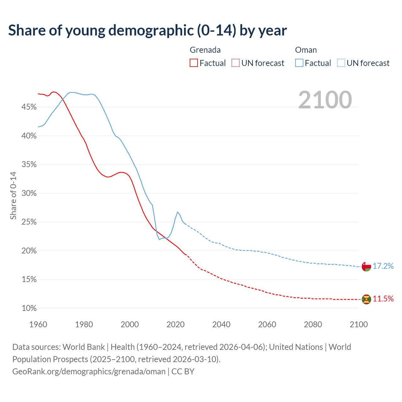 - The share of young demographic (0-15 years old) in Grenada is 19.4% vs 24.7% in Oman.