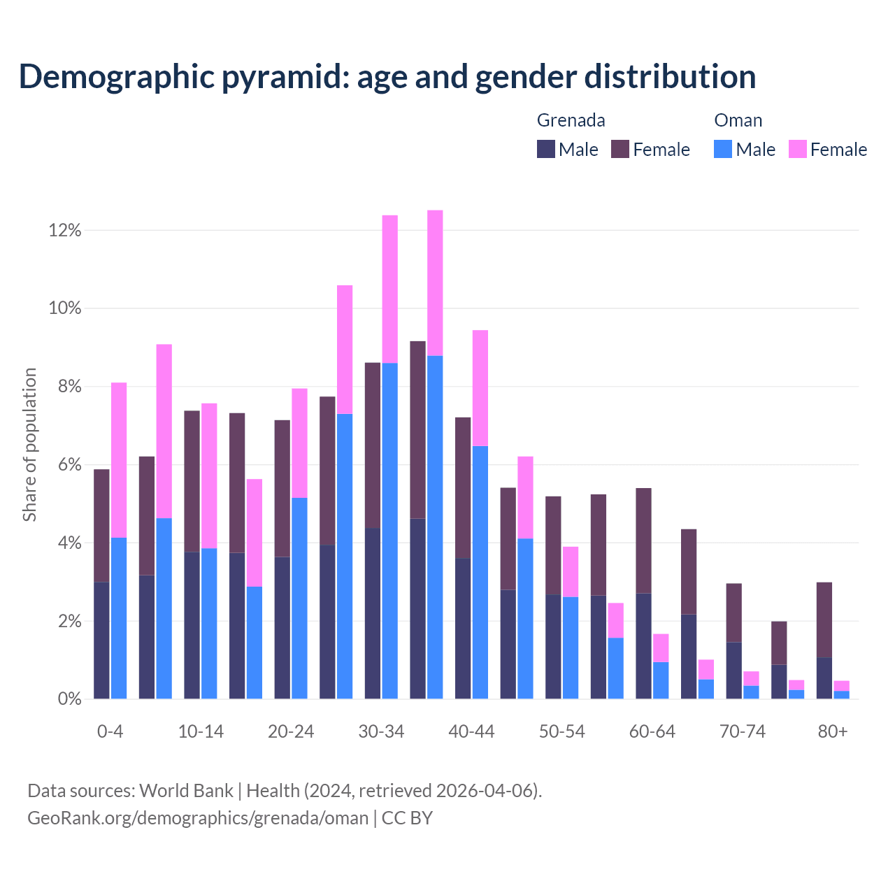 - The share of old-age demographic (65+) in Grenada is 12.2% vs 2.64% in Oman.
