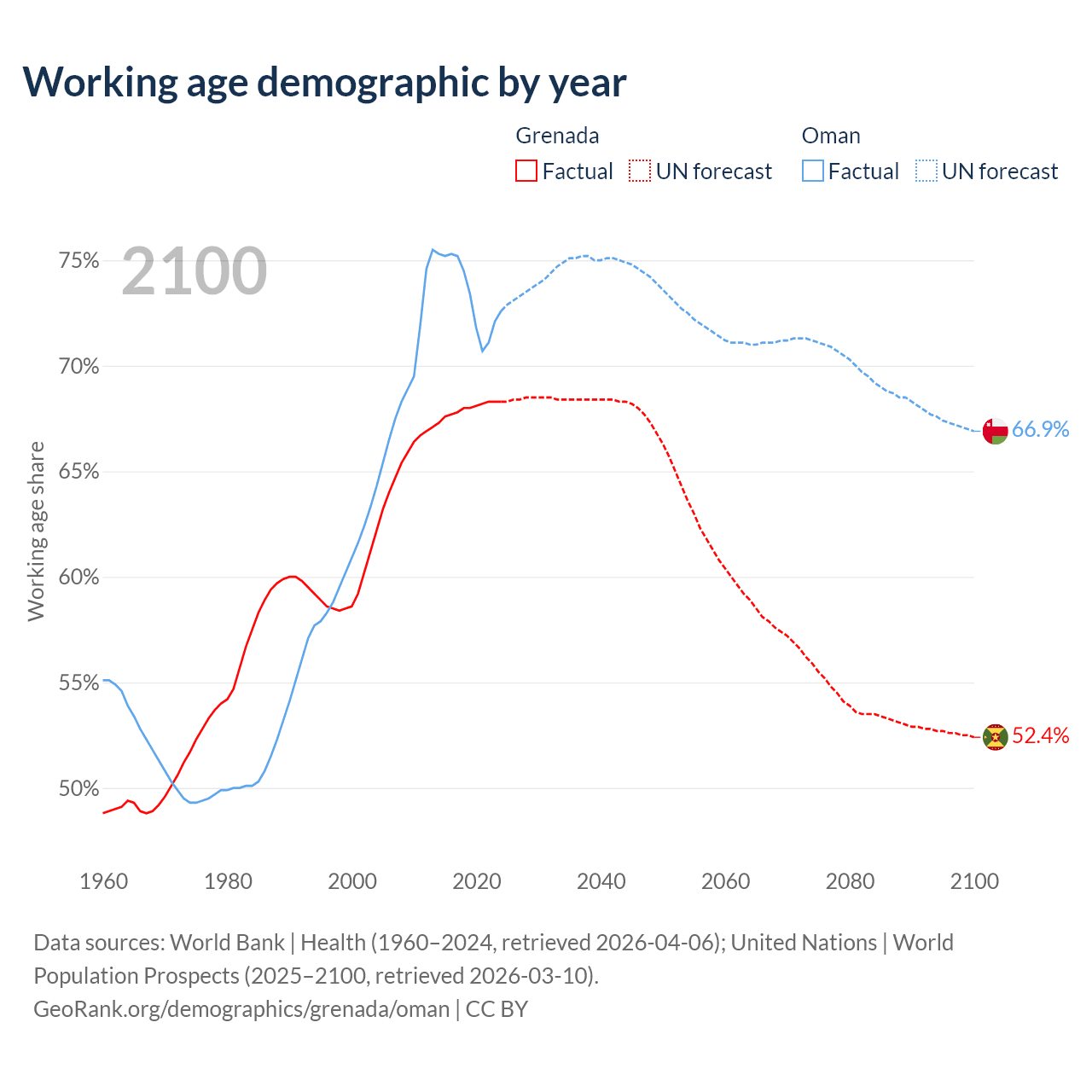 - Grenada has 80.2K working age adults (aged 15-64) vs 4.19M in Oman.