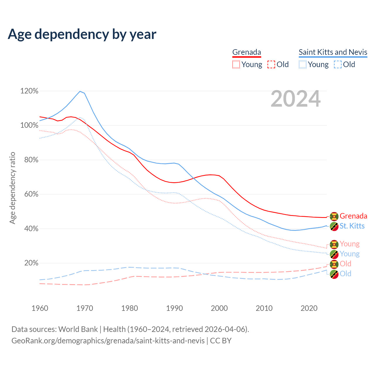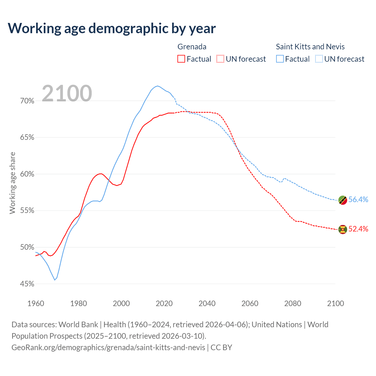 - Grenada has 80.2K working age adults (aged 15-64) vs 33.2K in Saint Kitts and Nevis.