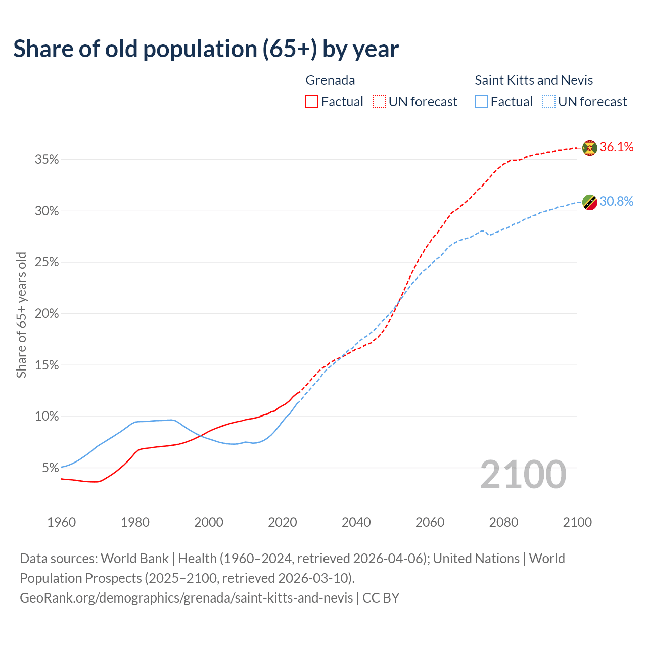 The share of older people aged 65 and over is 12.2% in Grenada and 11.2% in Saint Kitts and Nevis. Life expectancy in Grenada compared to Saint Kitts and Nevis .