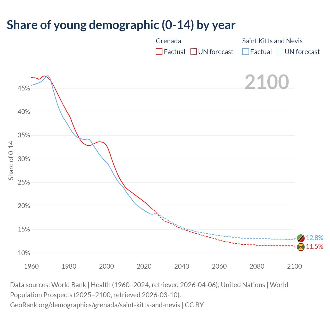 - The share of young demographic (0-15 years old) in Grenada is 19.4% vs 18.2% in Saint Kitts and Nevis.