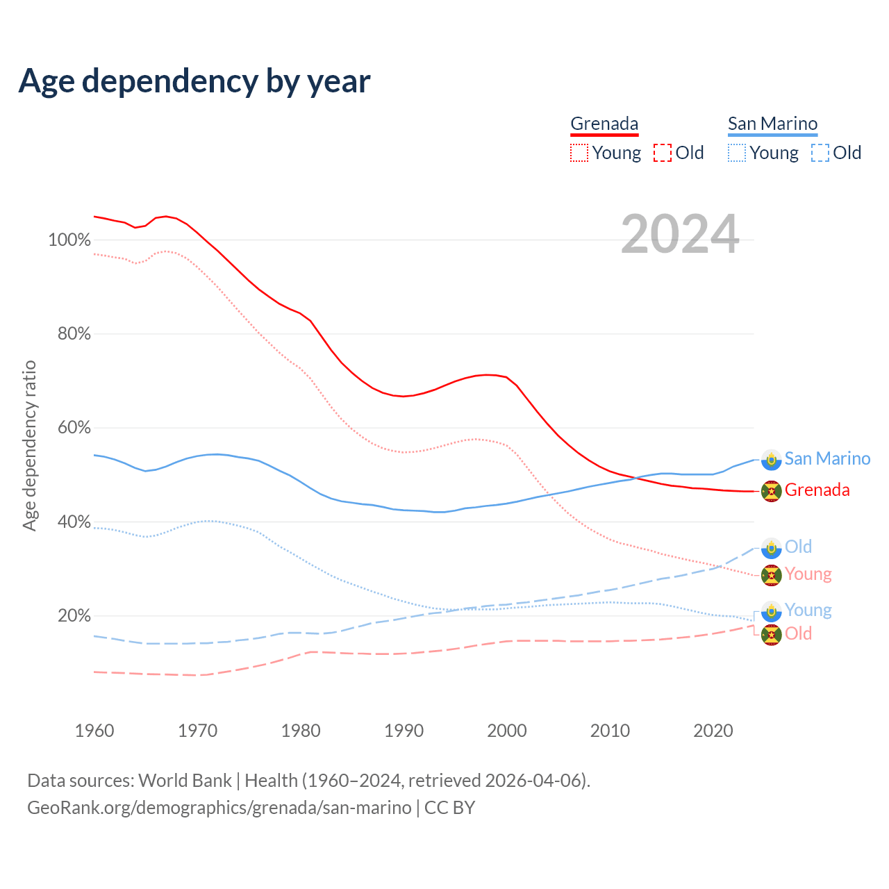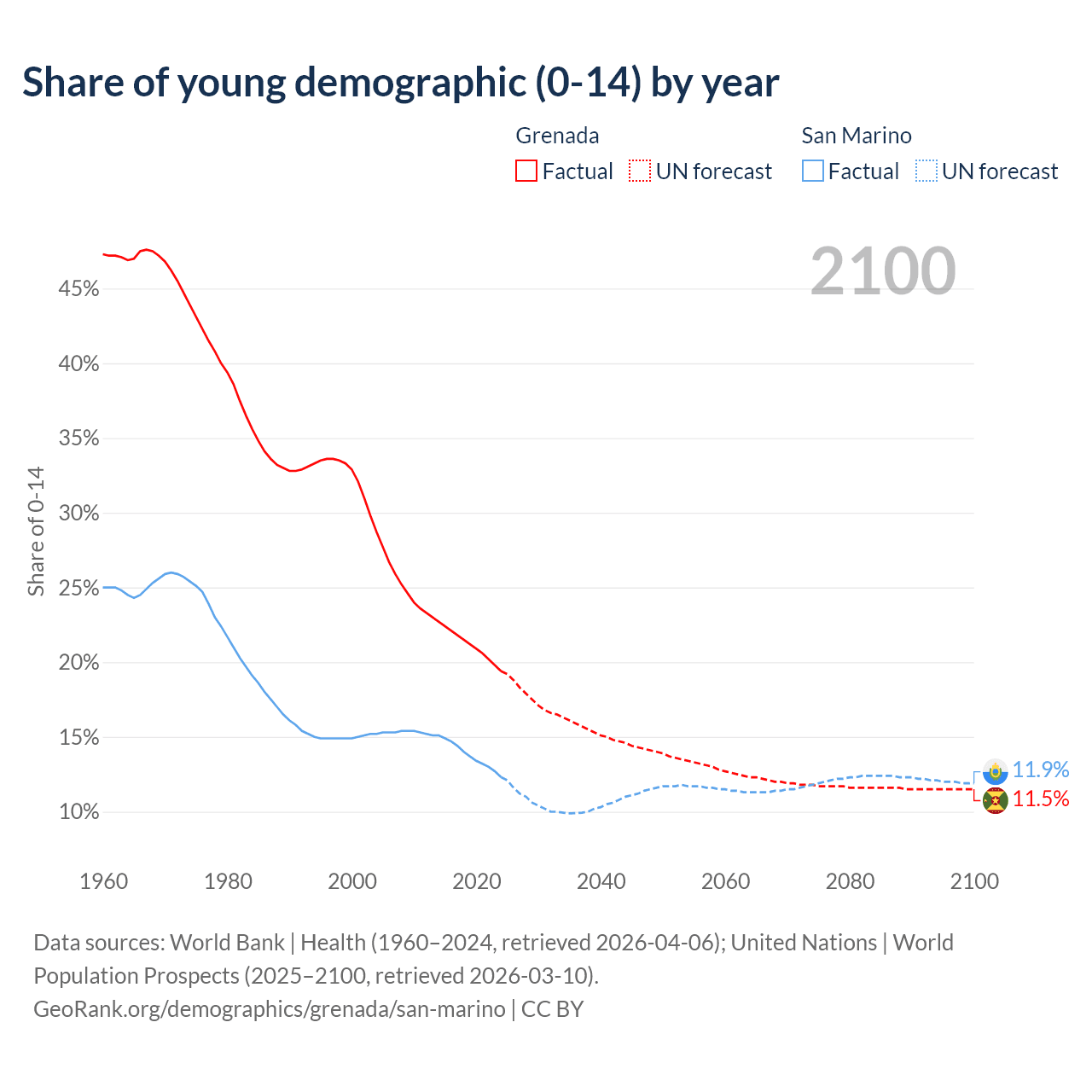 - The share of young demographic (0-15 years old) in Grenada is 19.4% vs 12.3% in San Marino.