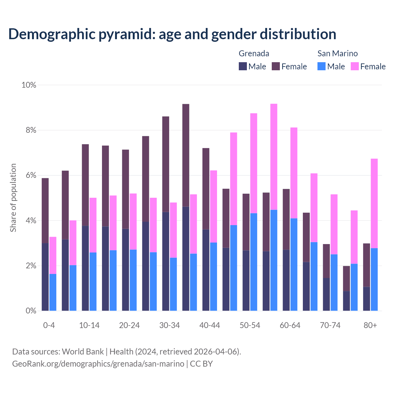 - The share of old-age demographic (65+) in Grenada is 12.2% vs 22.4% in San Marino.