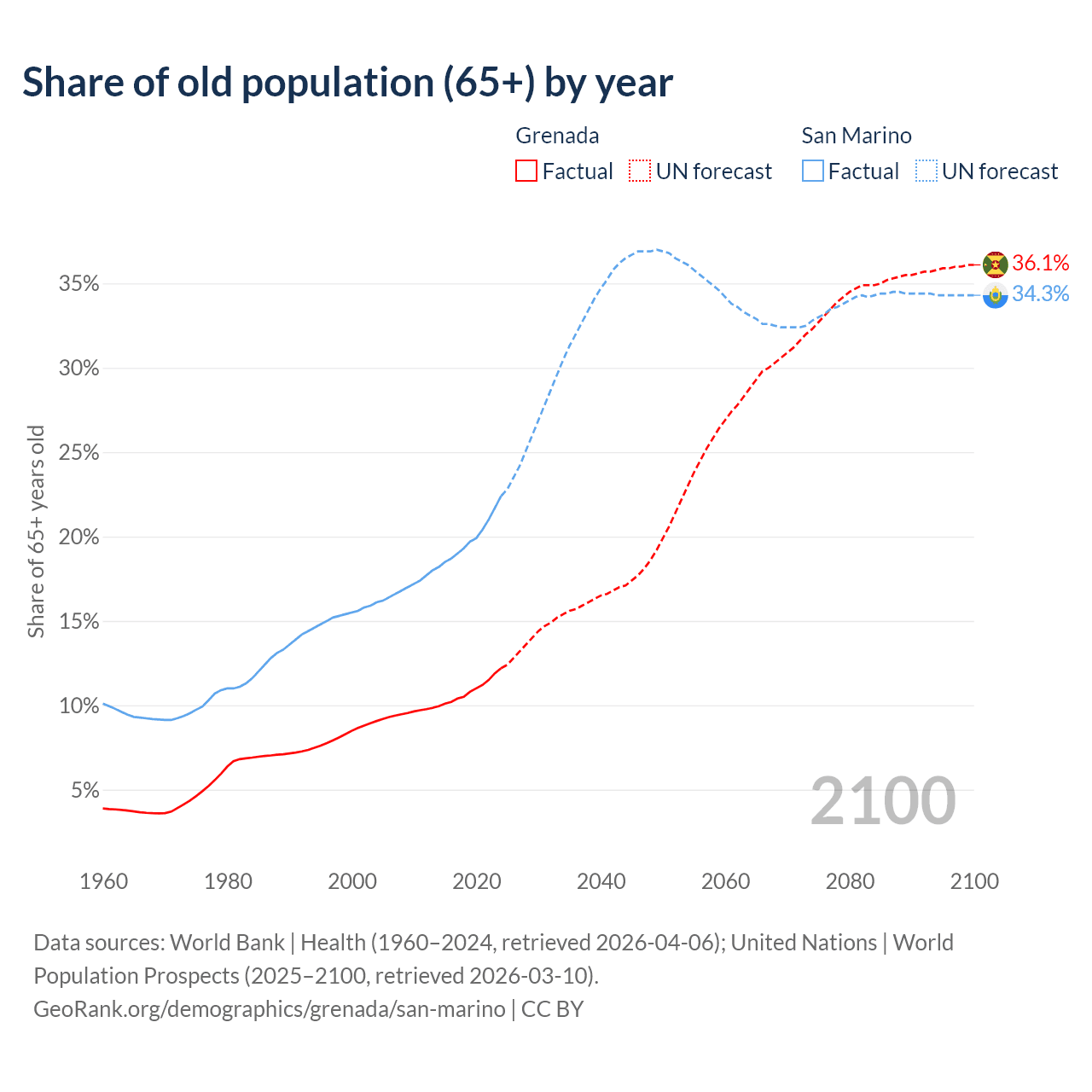 The share of older people aged 65 and over is 12.2% in Grenada and 22.4% in San Marino. Life expectancy in Grenada compared to San Marino .