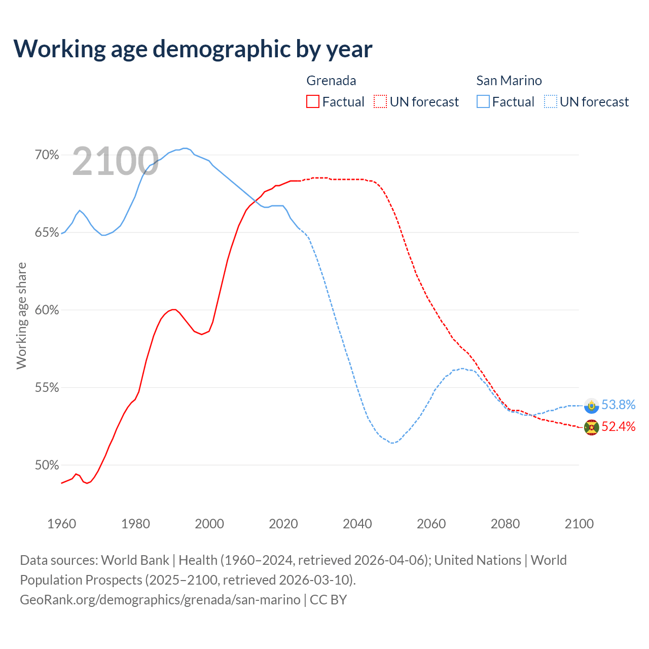 - Grenada has 80.2K working age adults (aged 15-64) vs 22.2K in San Marino.