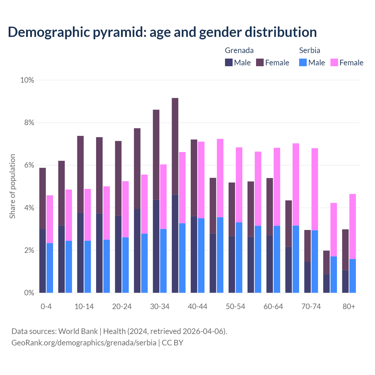 - Grenada is ranked 77/196 by median age (oldest to youngest) vs 15/196 for Serbia.