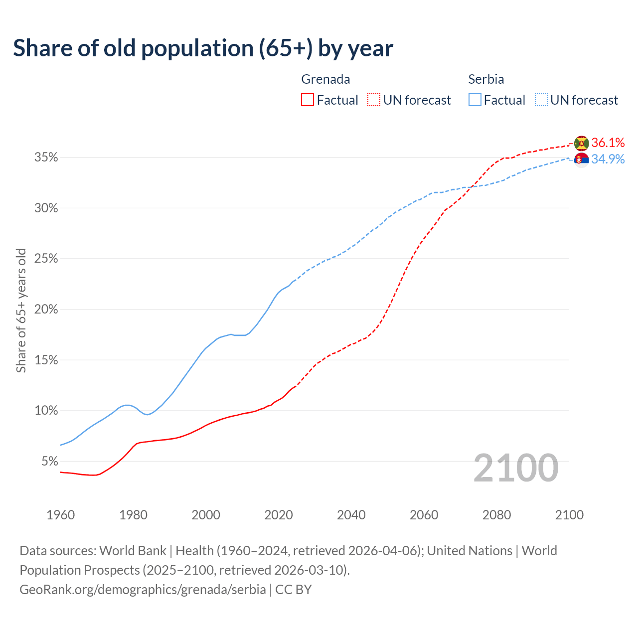 Median age Grenada vs Serbia, 1960-2100