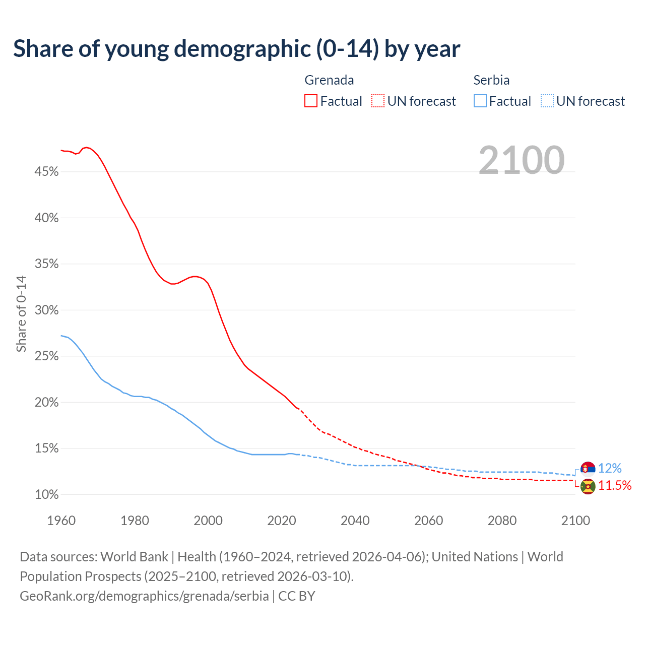 - The share of young demographic (0-15 years old) in Grenada is 19.4% vs 14.3% in Serbia.