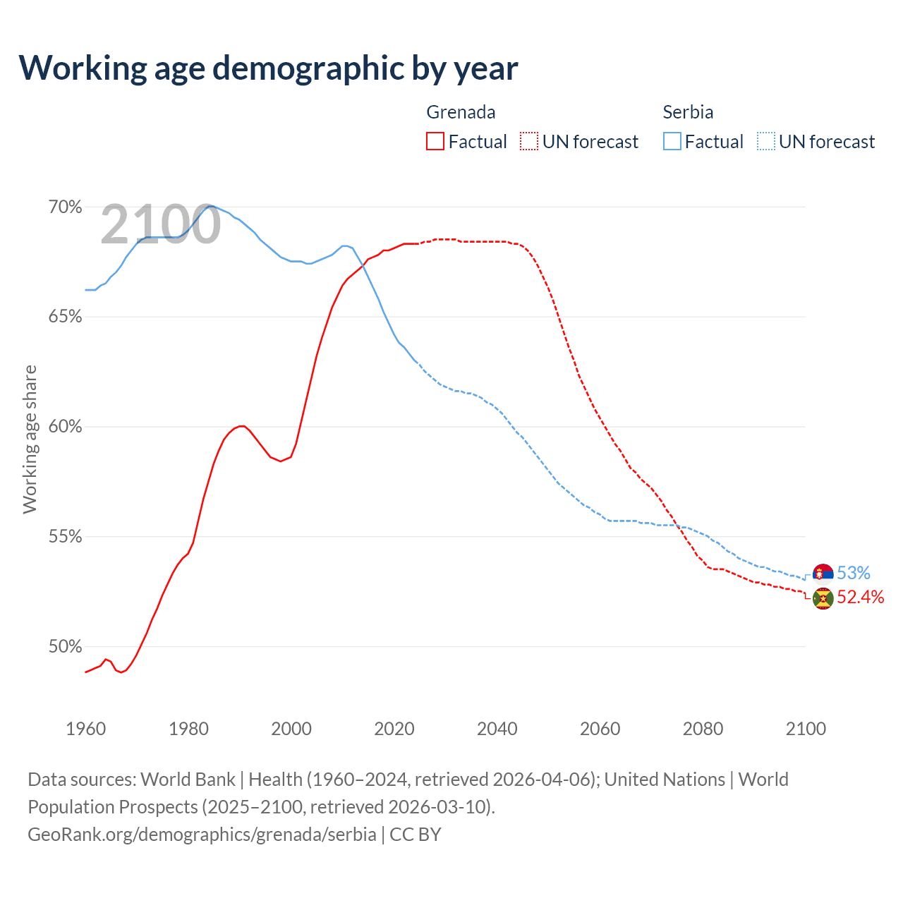 - Grenada has 80.2K working age adults (aged 15-64) vs 4.09M in Serbia.