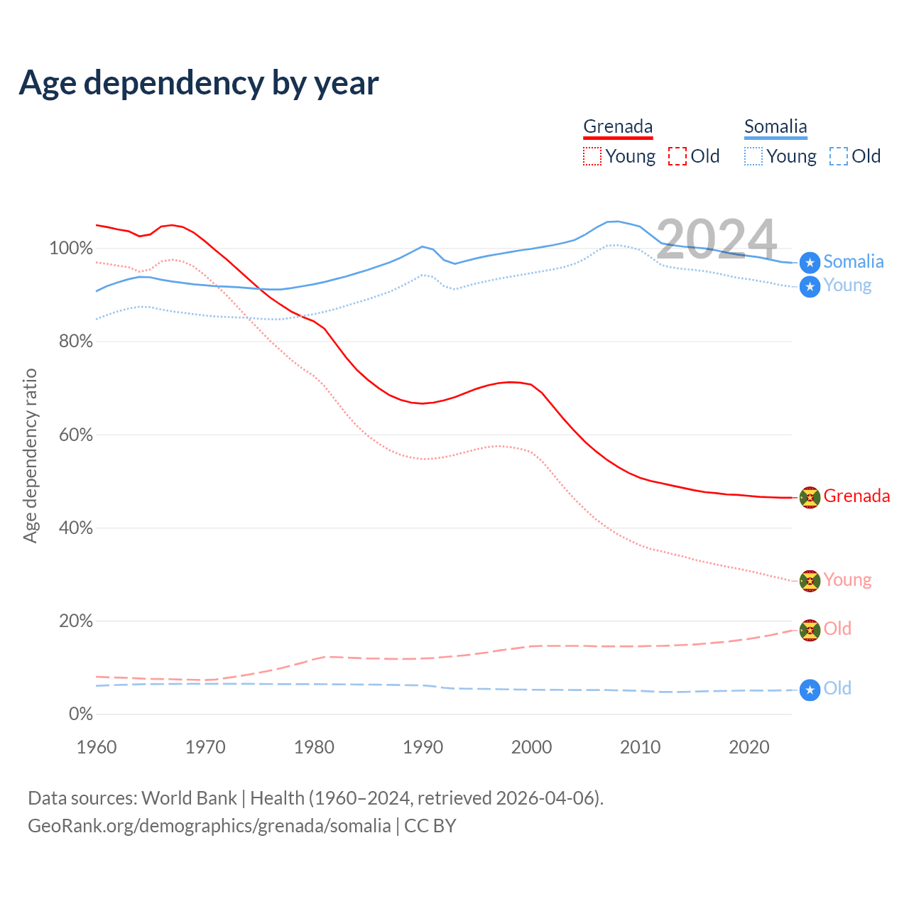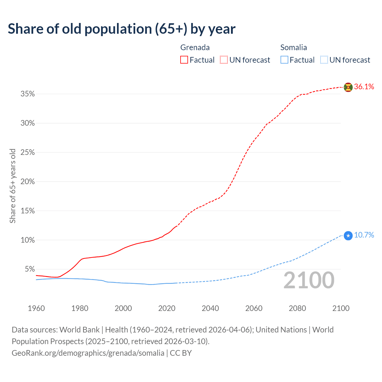 - The share of old-age demographic (65+) in Grenada is 12.2% vs 2.59% in Somalia.