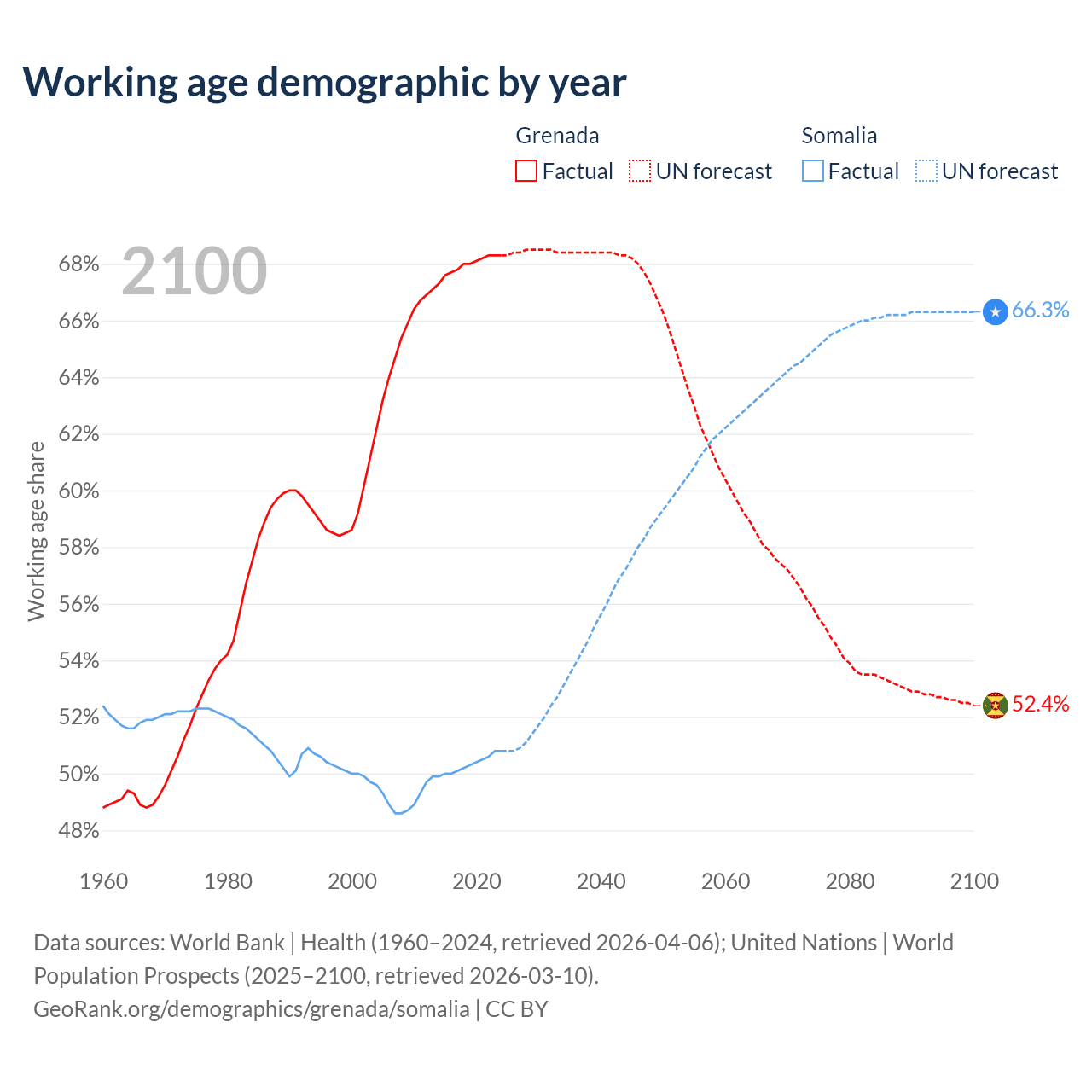 - The share of young demographic (0-15 years old) in Grenada is 19.4% vs 46.6% in Somalia.