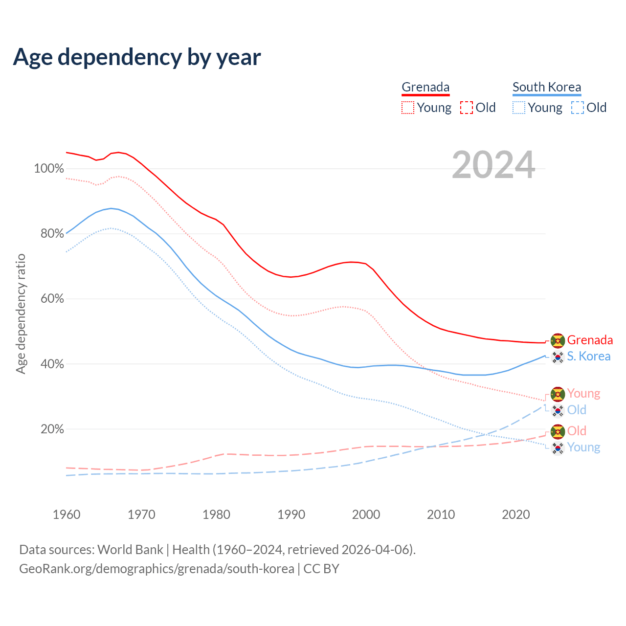 - Grenada is ranked 77/196 by median age (oldest to youngest) vs 10/196 for South Korea.