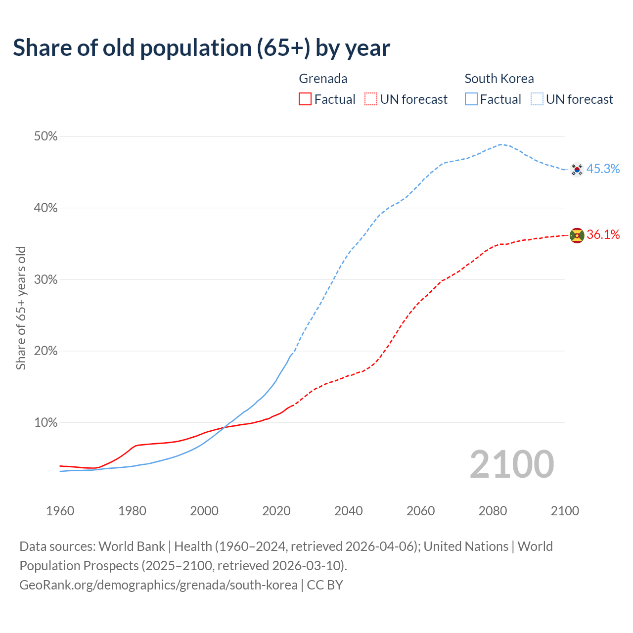 The share of older people aged 65 and over is 12.2% in Grenada and 19.3% in South Korea. Life expectancy in Grenada compared to South Korea .