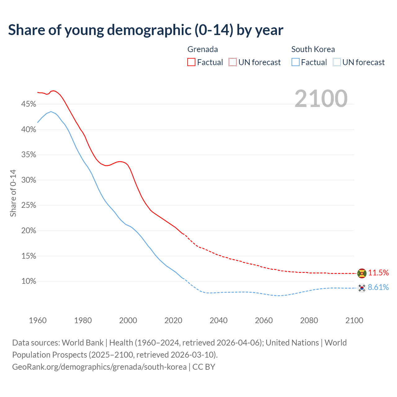 - The share of young demographic (0-15 years old) in Grenada is 19.4% vs 10.6% in South Korea.