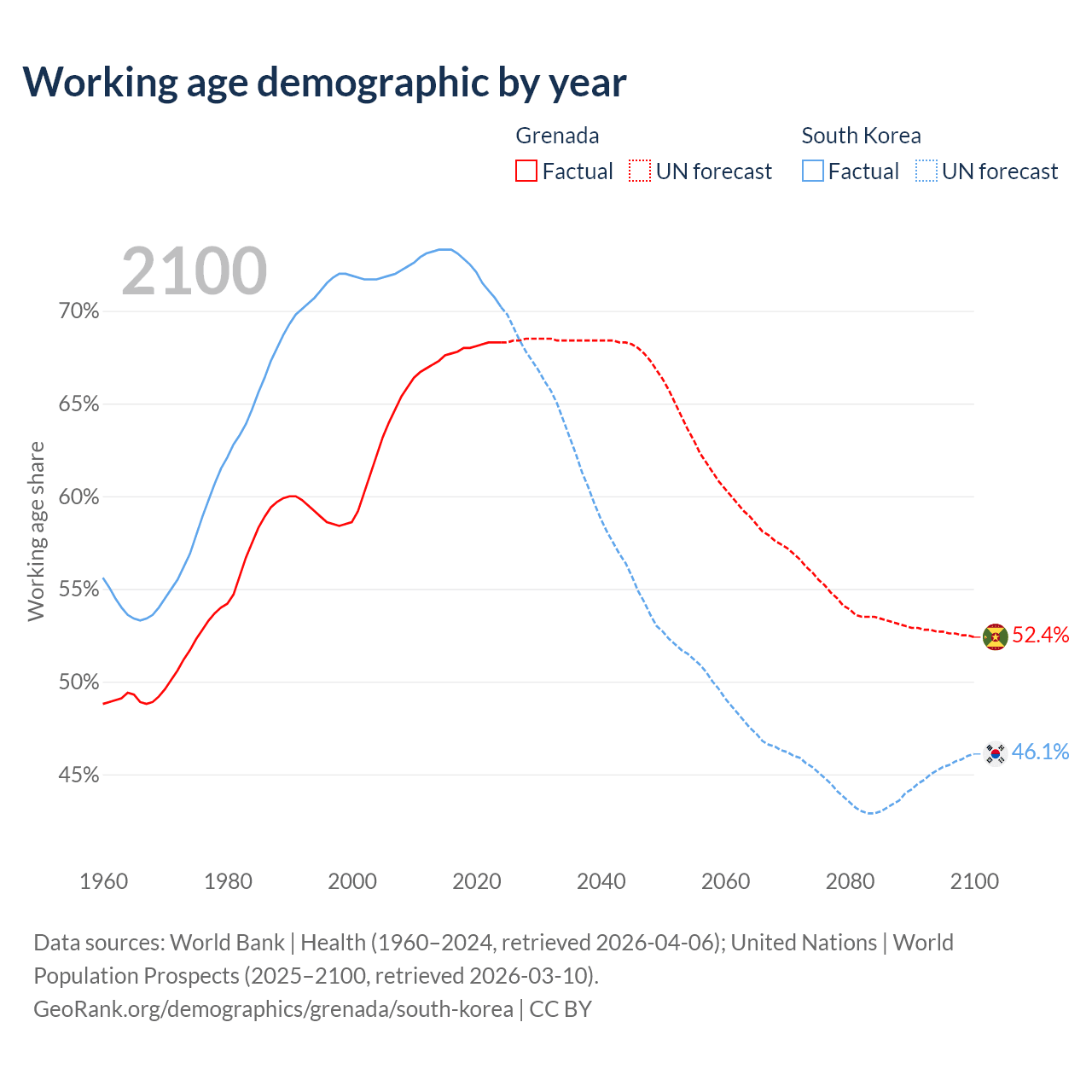 - Grenada has 80.2K working age adults (aged 15-64) vs 36.2M in South Korea.