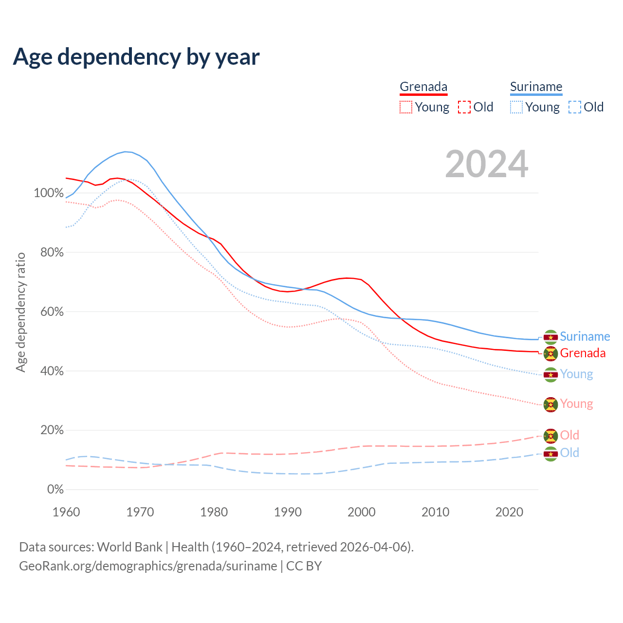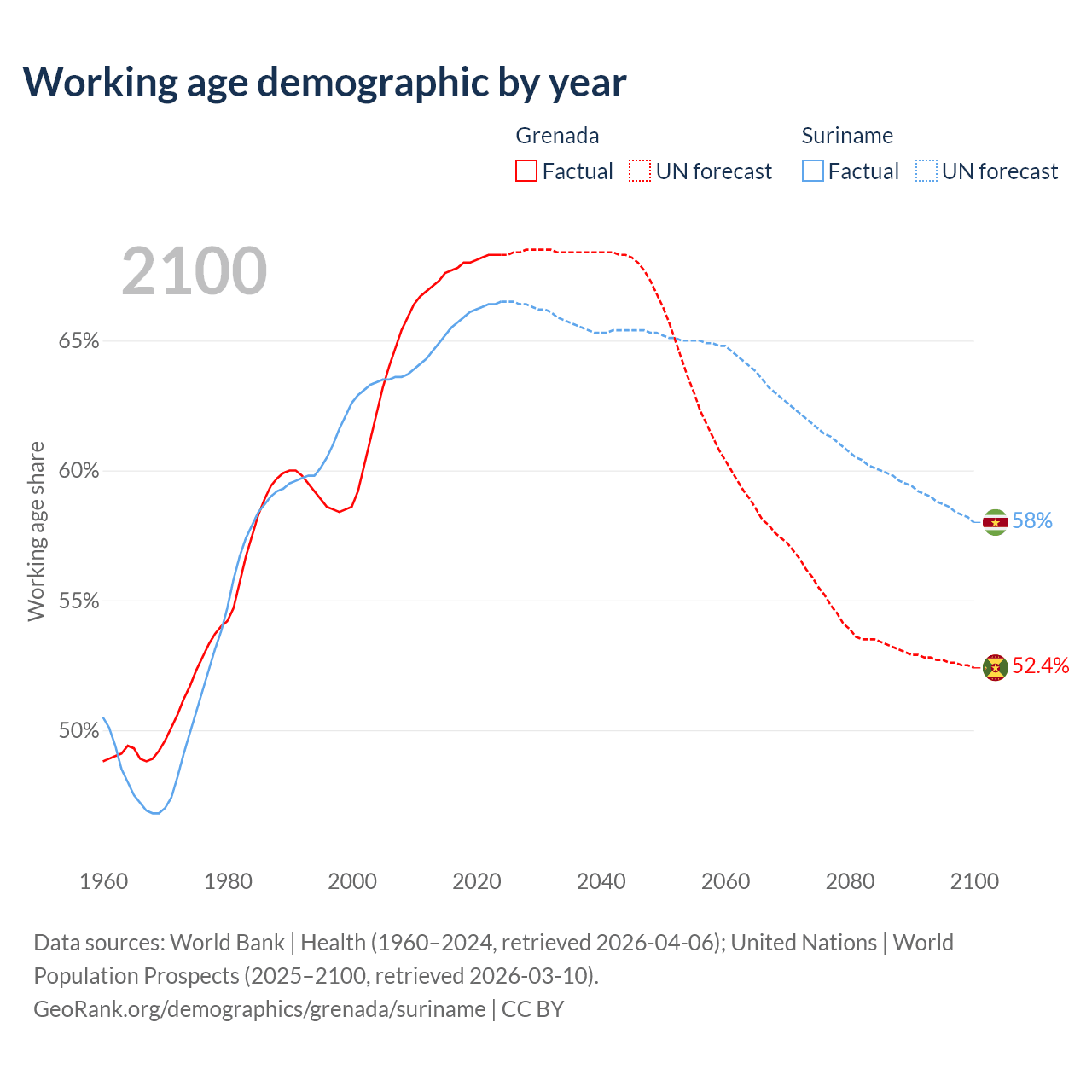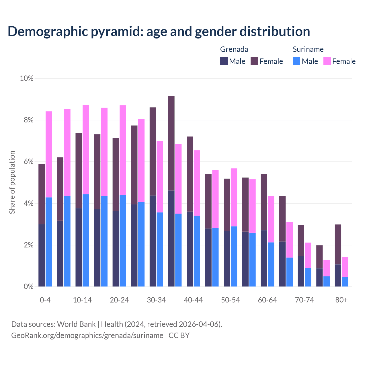 - The share of old-age demographic (65+) in Grenada is 12.2% vs 7.9% in Suriname.