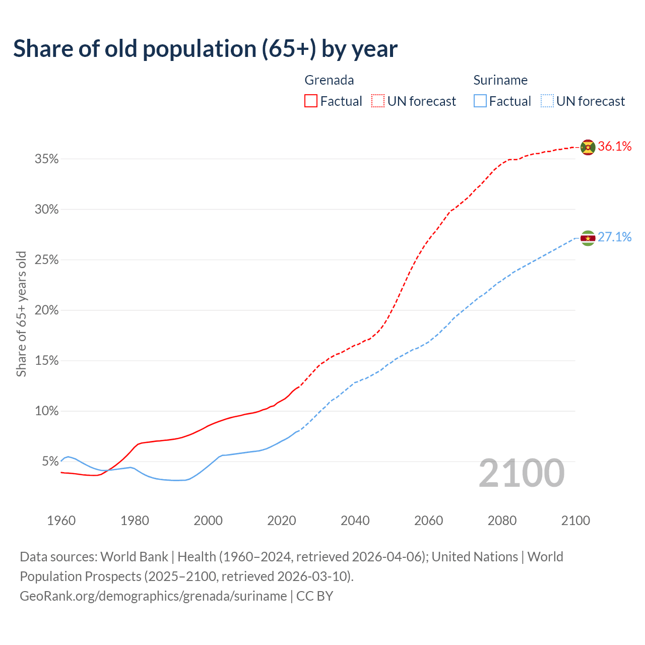 The share of older people aged 65 and over is 12.2% in Grenada and 7.9% in Suriname. Life expectancy in Grenada compared to Suriname .