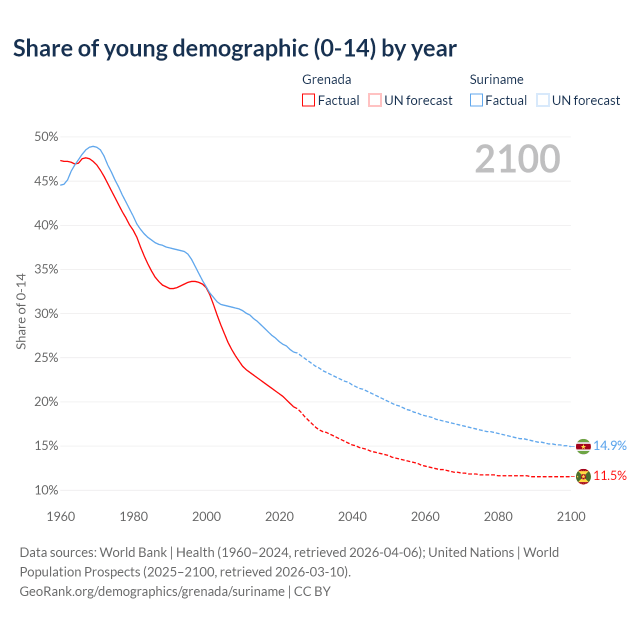 - The share of young demographic (0-15 years old) in Grenada is 19.4% vs 25.6% in Suriname.