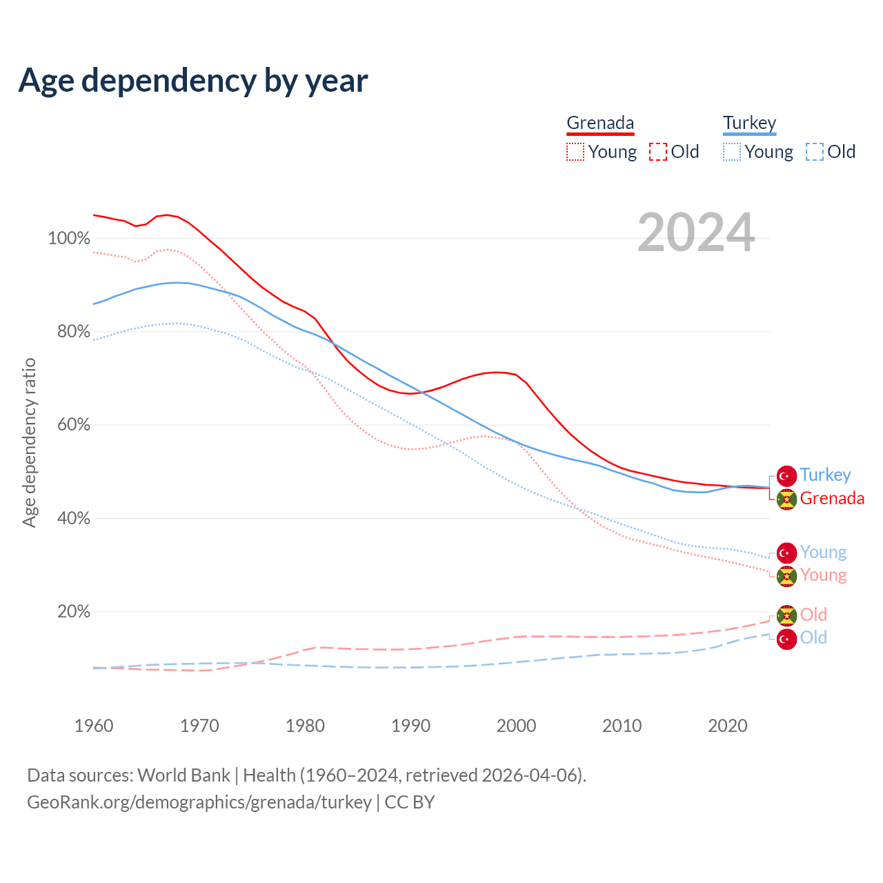 - Grenada is ranked 77/196 by median age (oldest to youngest) vs 83/196 for Turkey.