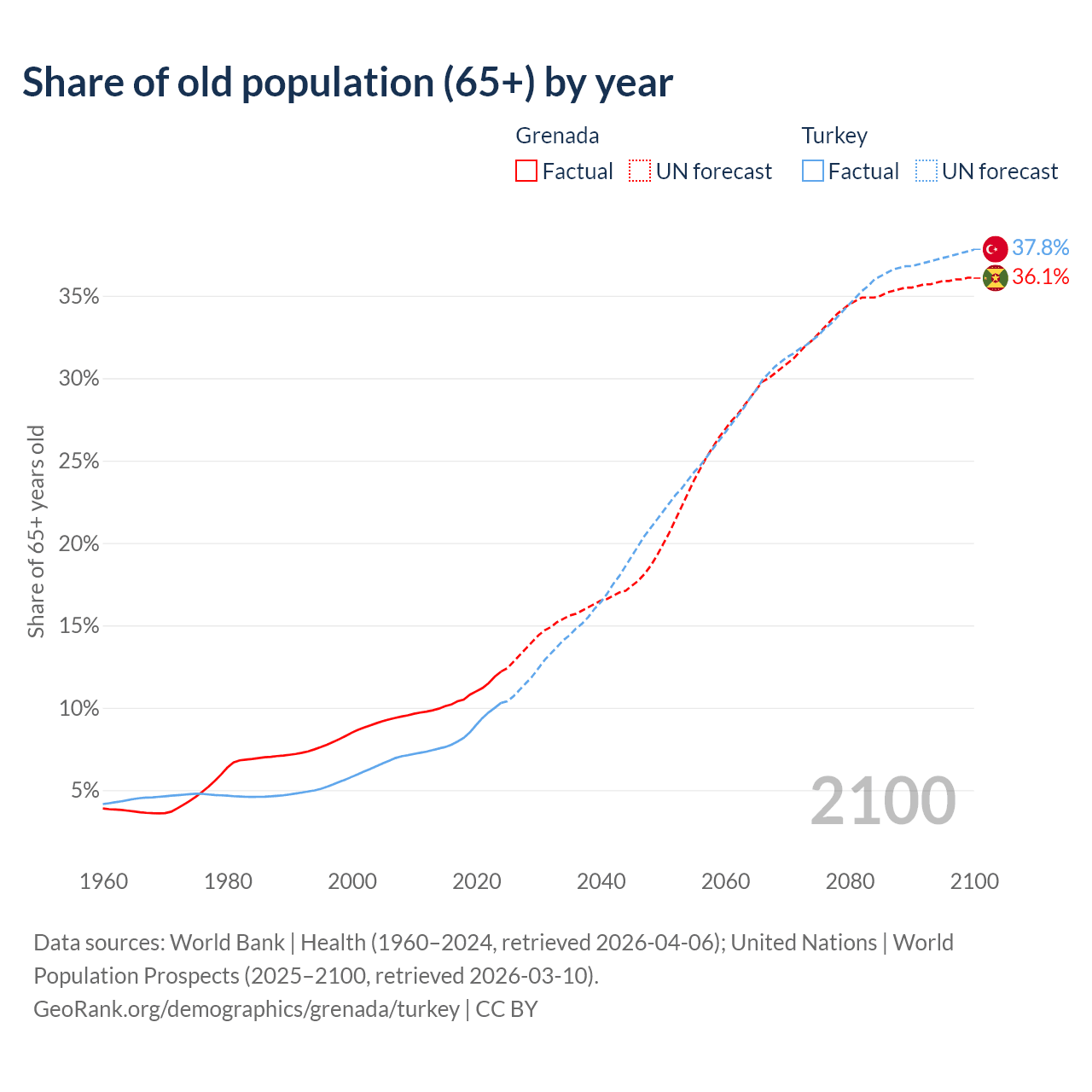 The share of older people aged 65 and over is 12.2% in Grenada and 10.3% in Turkey. Life expectancy in Grenada compared to Turkey .