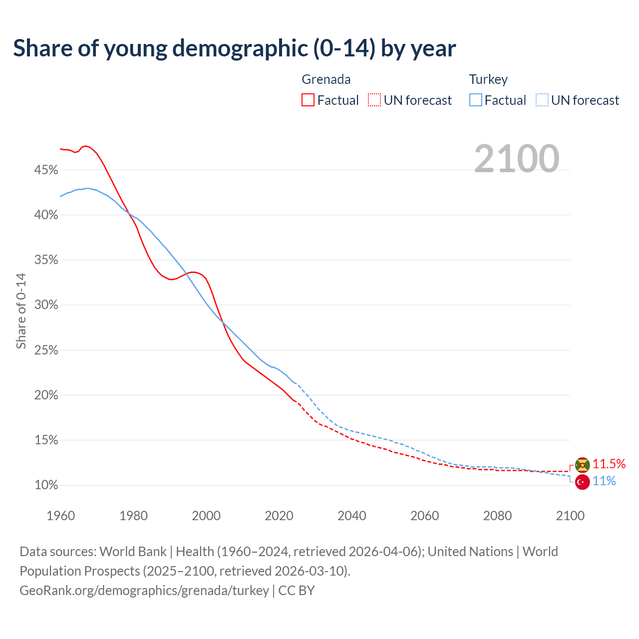 - The share of young demographic (0-15 years old) in Grenada is 19.4% vs 21.4% in Turkey.