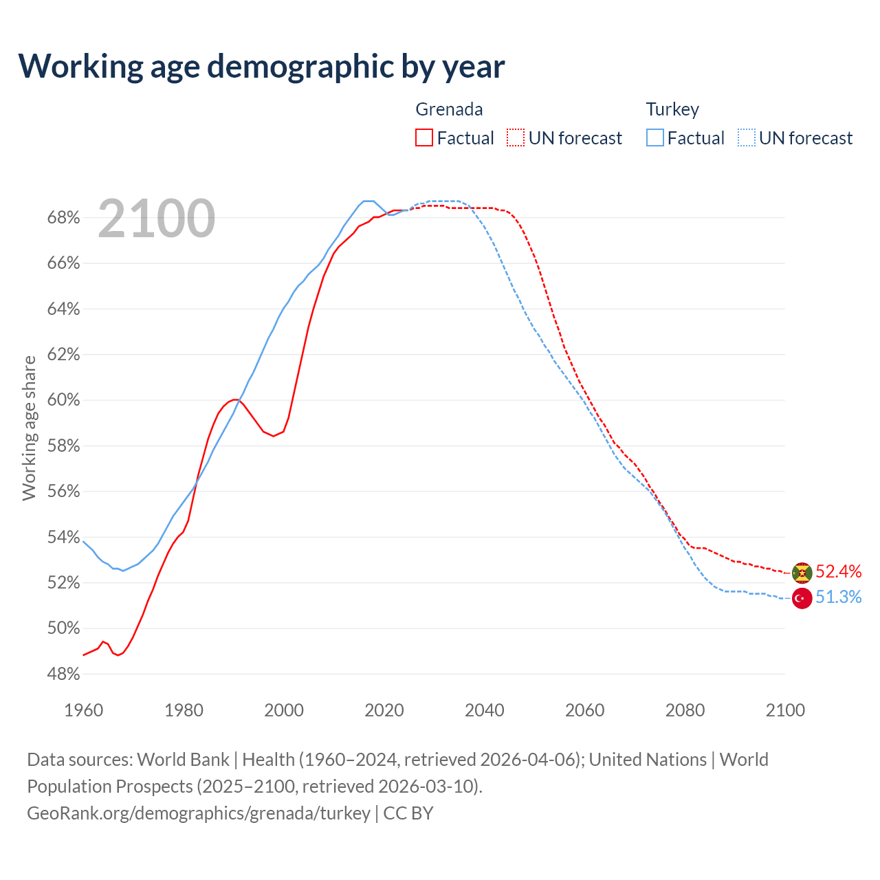 - Grenada has 80.2K working age adults (aged 15-64) vs 58.7M in Turkey.