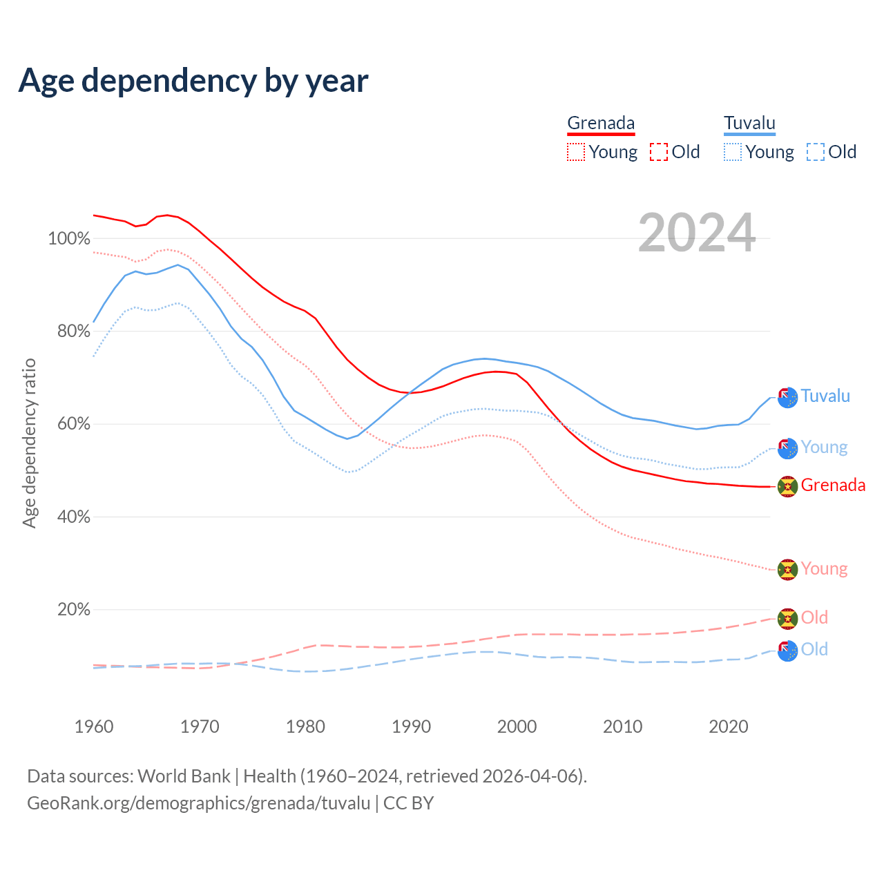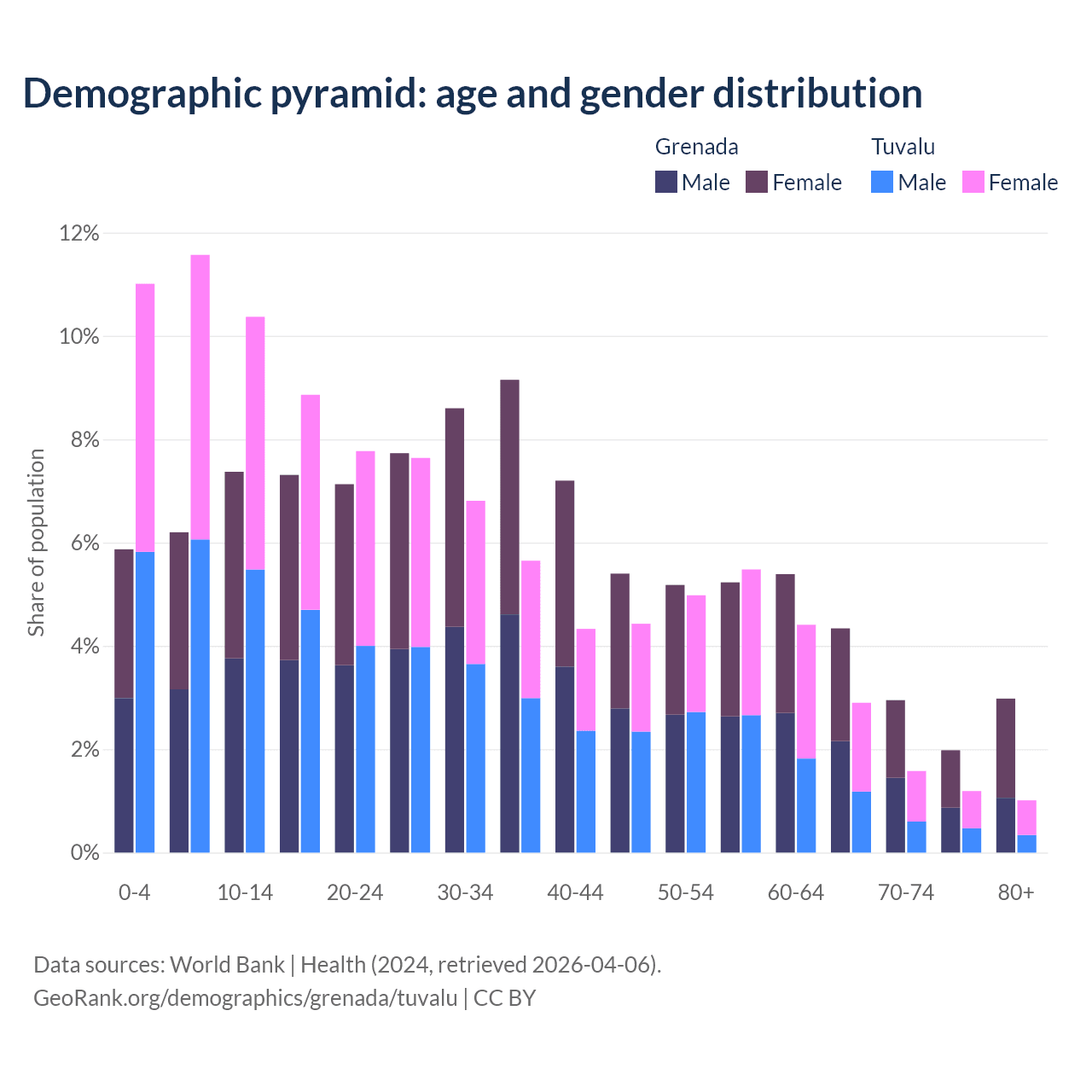 - The share of old-age demographic (65+) in Grenada is 12.2% vs 6.67% in Tuvalu.