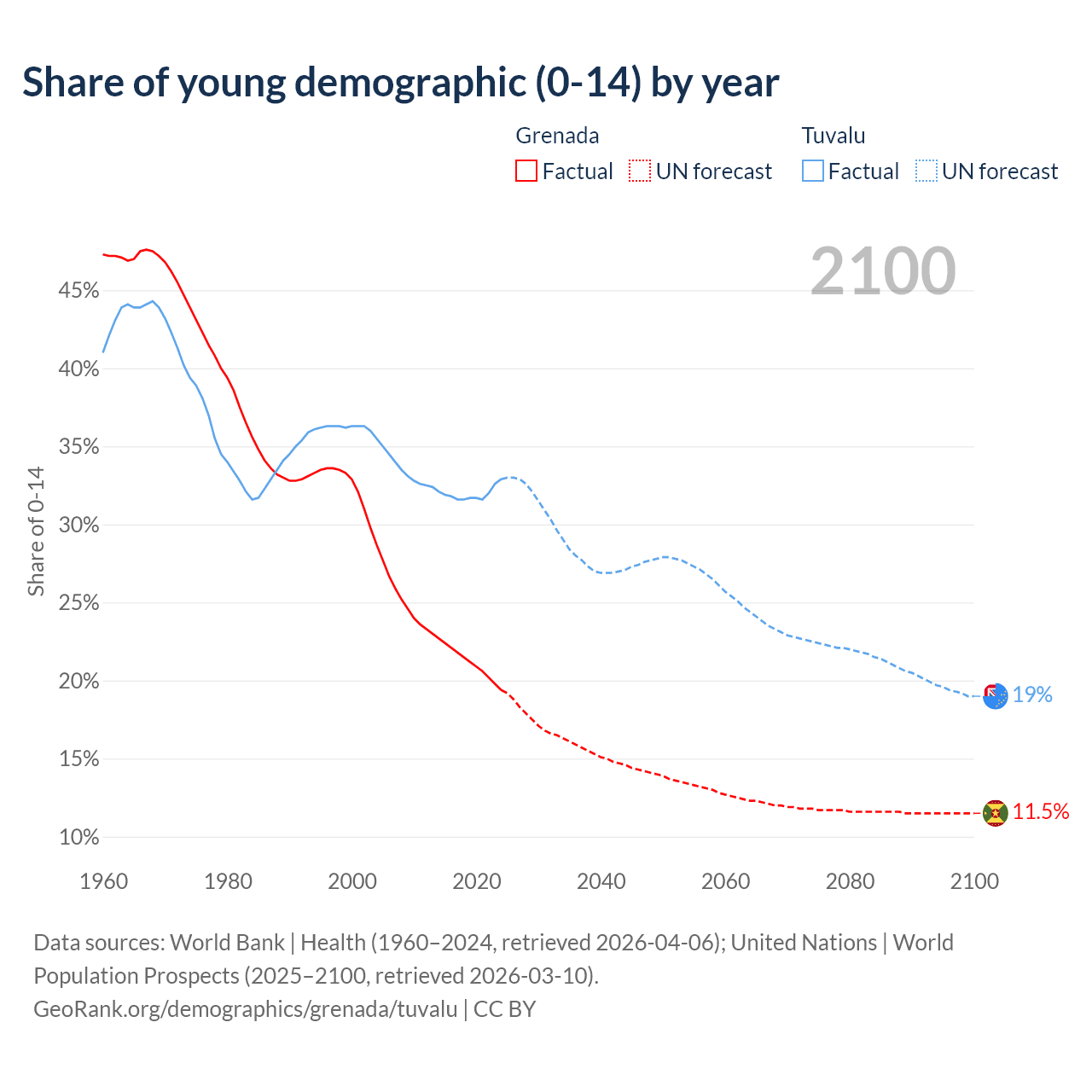 - The share of young demographic (0-15 years old) in Grenada is 19.4% vs 32.9% in Tuvalu.