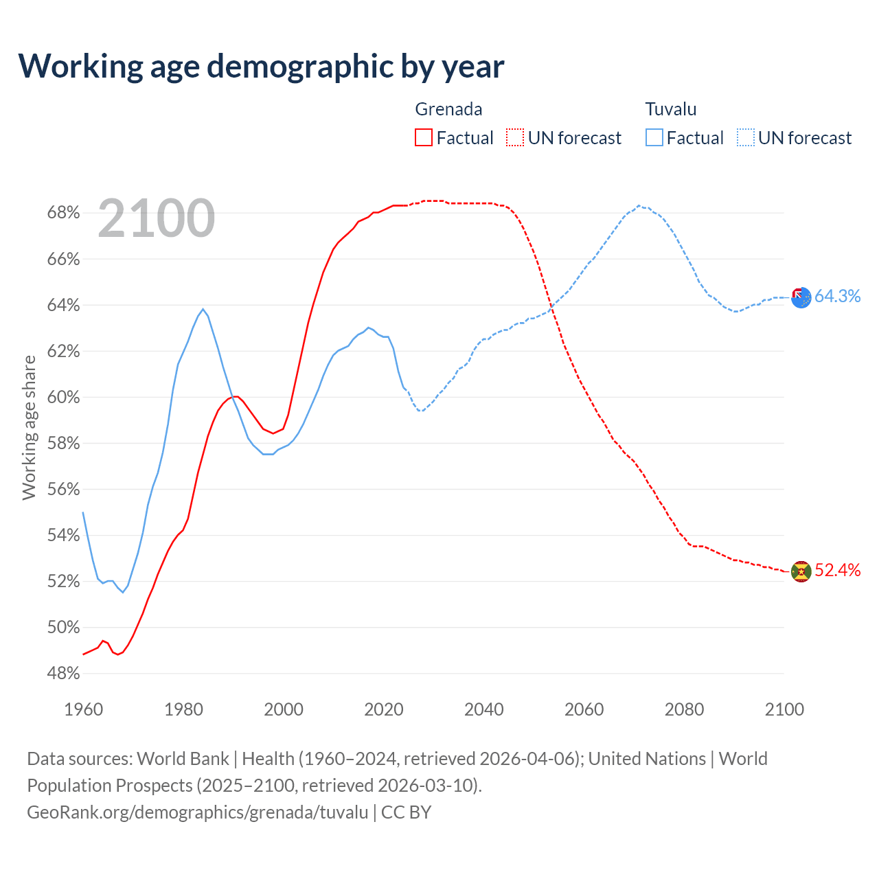 - Grenada has 80.2K working age adults (aged 15-64) vs 5.64K in Tuvalu.