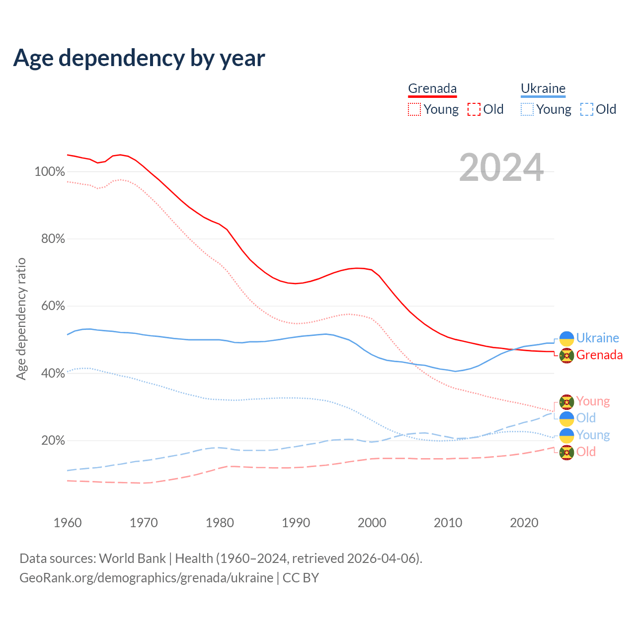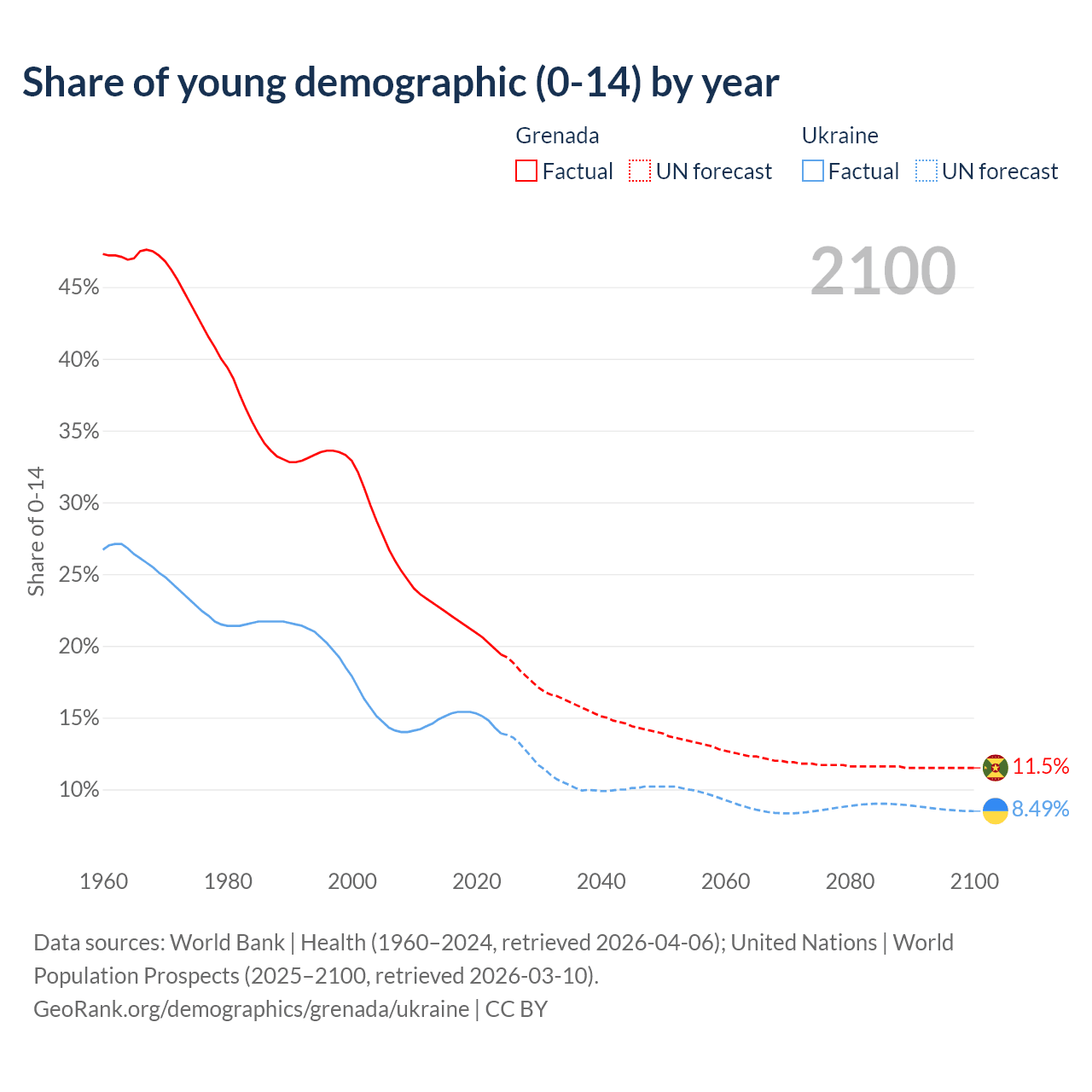 - The share of young demographic (0-15 years old) in Grenada is 19.4% vs 13.9% in Ukraine.