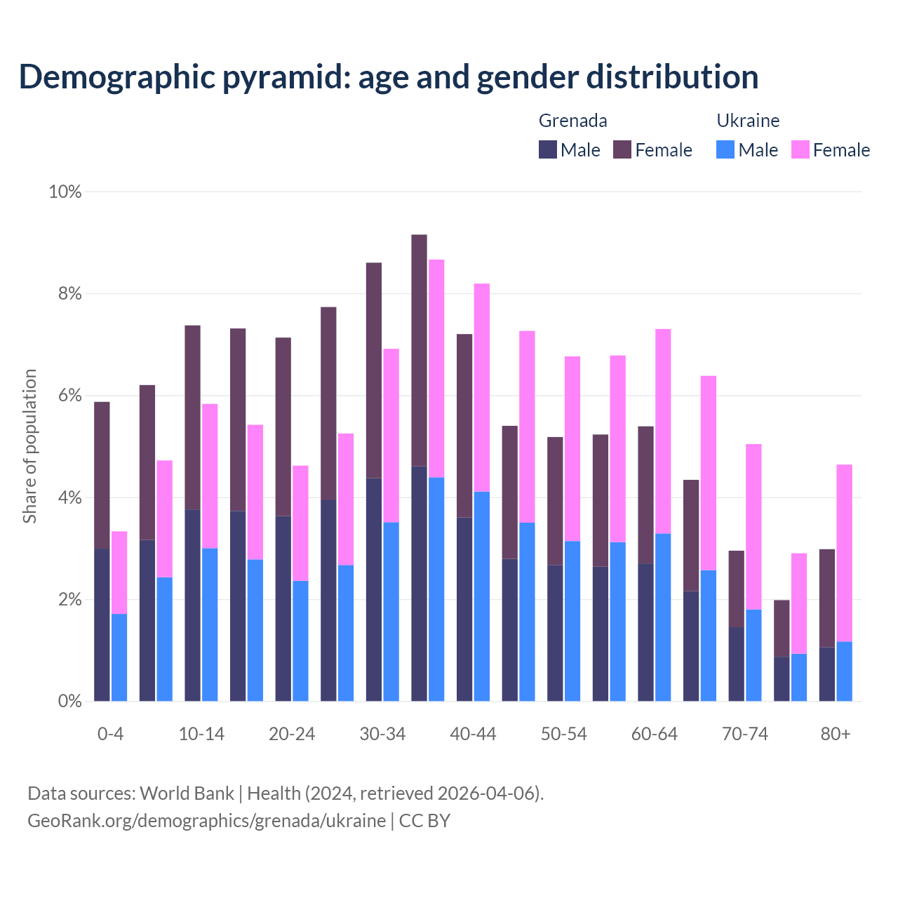 - Grenada is ranked 77/196 by median age (oldest to youngest) vs 26/196 for Ukraine.