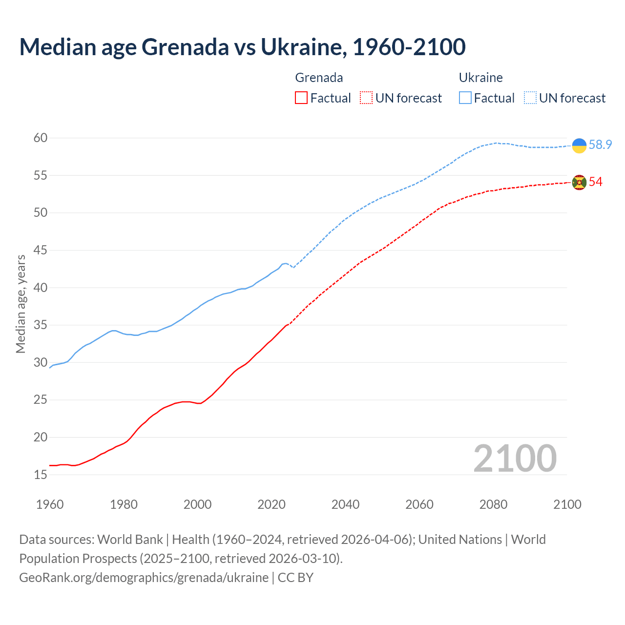 Median age Grenada vs Ukraine, 1960-2100