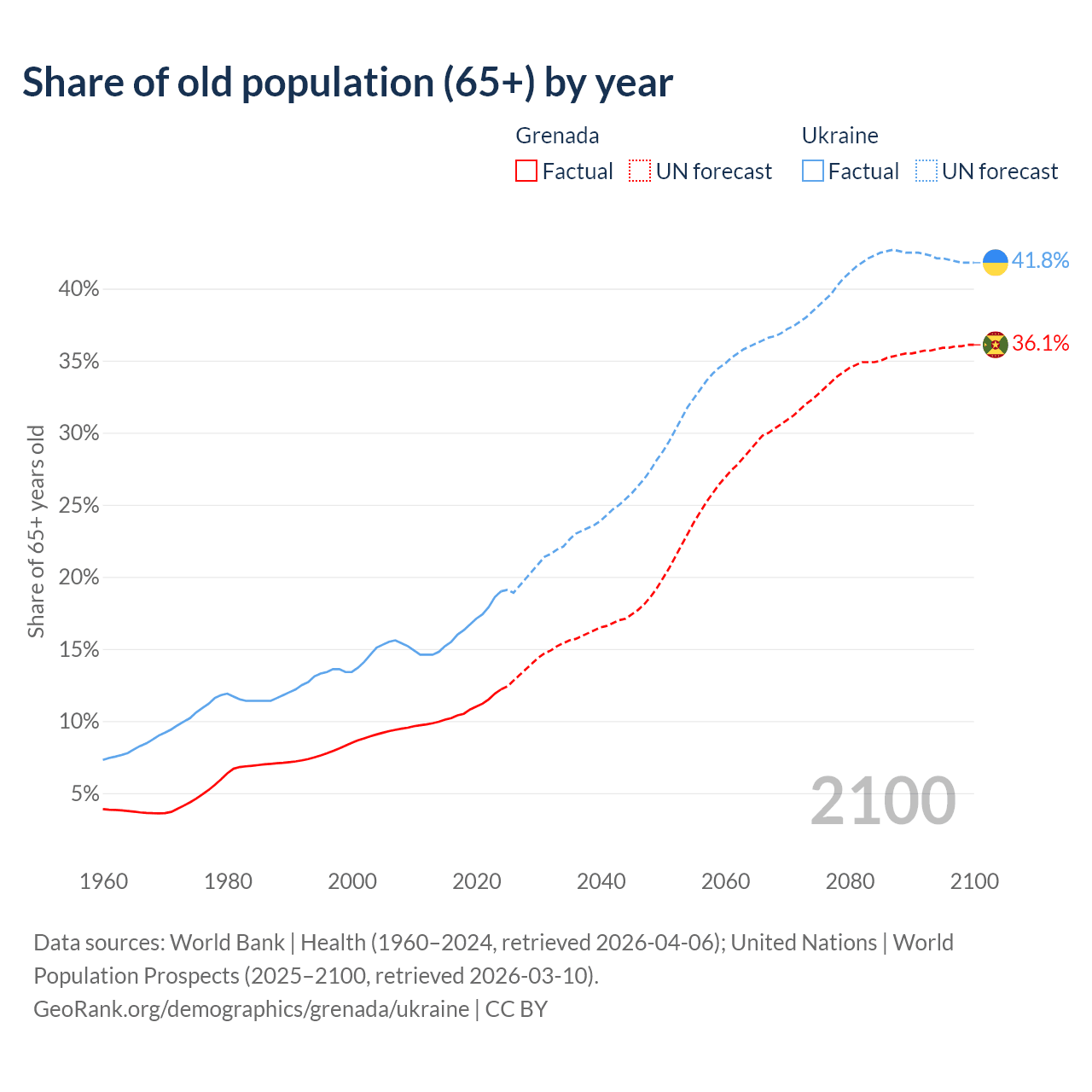 The share of older people aged 65 and over is 12.2% in Grenada and 19% in Ukraine. Life expectancy in Grenada compared to Ukraine .