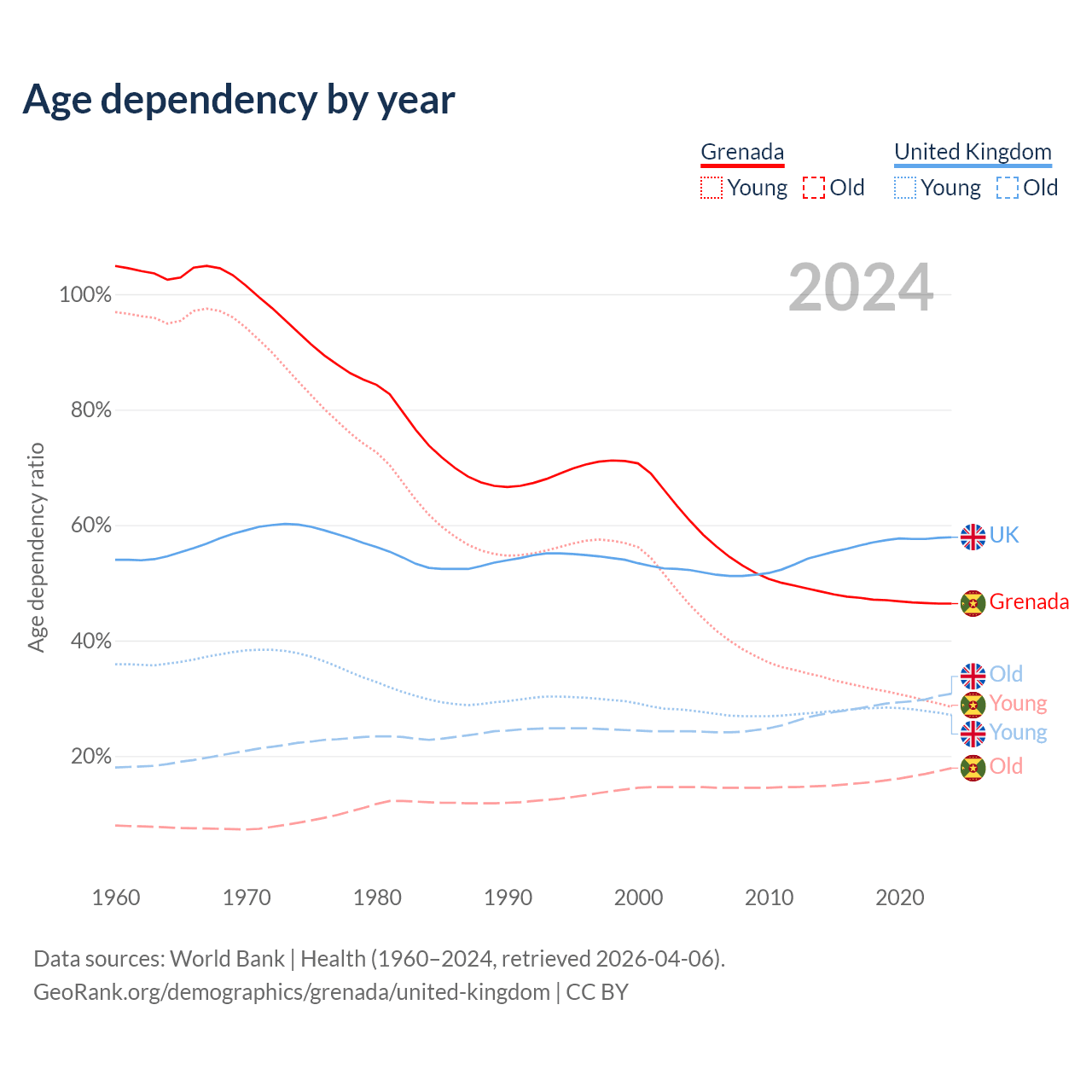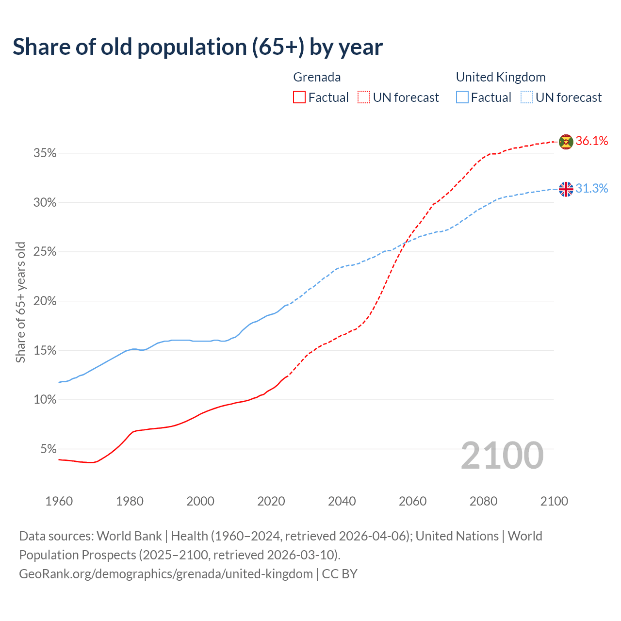 - The share of old-age demographic (65+) in Grenada is 12.2% vs 19.5% in the United Kingdom.