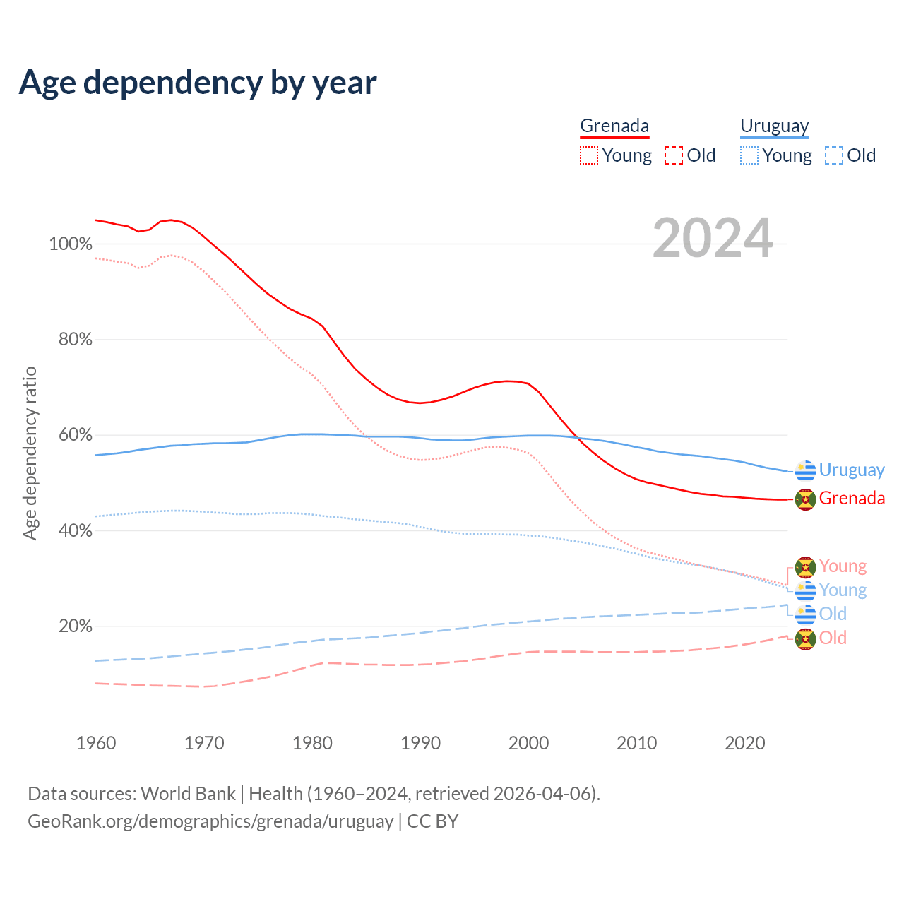 - The share of young demographic (0-15 years old) in Grenada is 19.4% vs 18.3% in Uruguay.