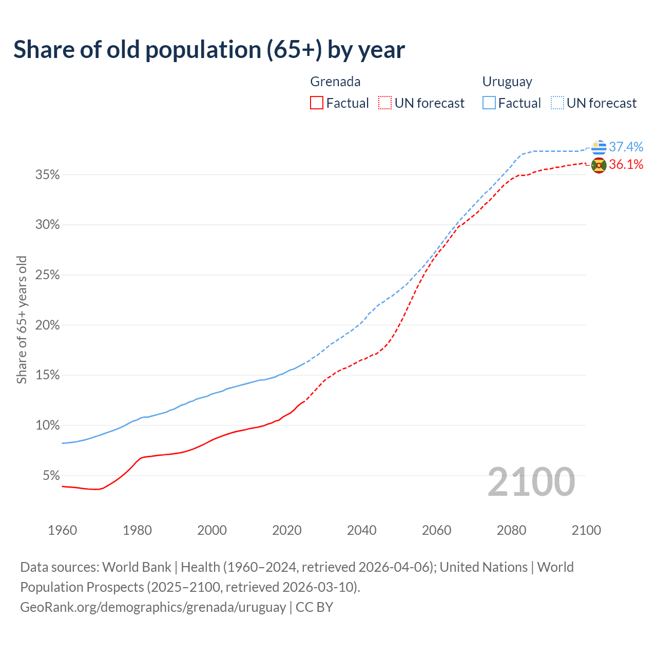 The share of older people aged 65 and over is 12.2% in Grenada and 16% in Uruguay. Life expectancy in Grenada compared to Uruguay .